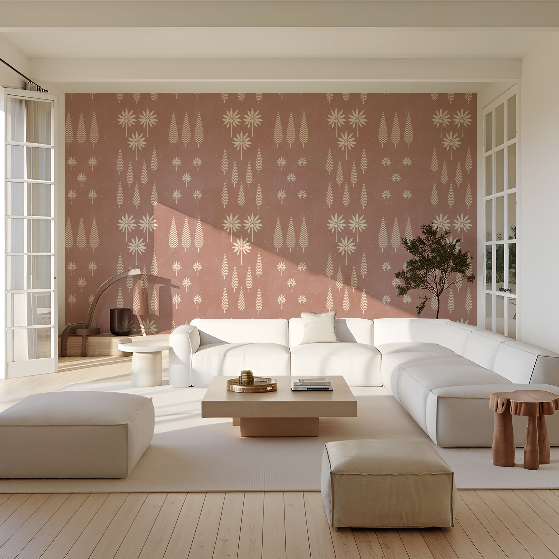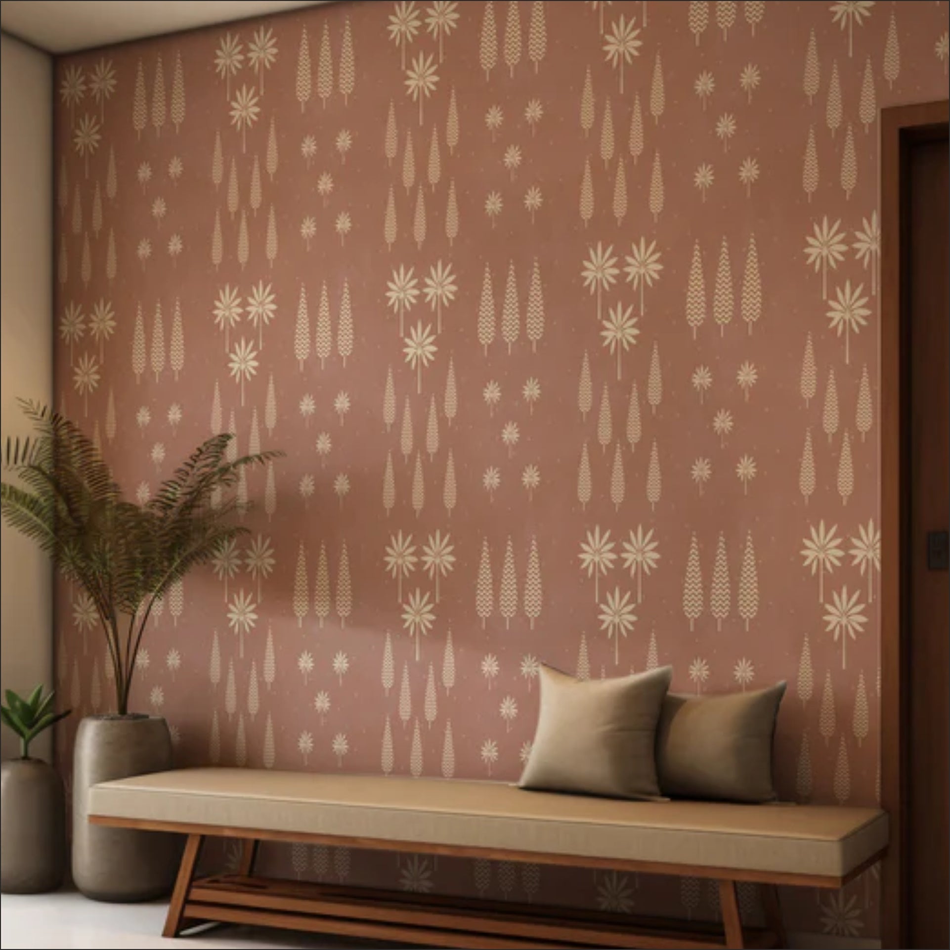 Sacred Pichwai trees on a rich brown background brings warmth and spiritual charm, making it ideal as a Pichwai wallpaper for home or for creating a serene vibe in office spaces.
