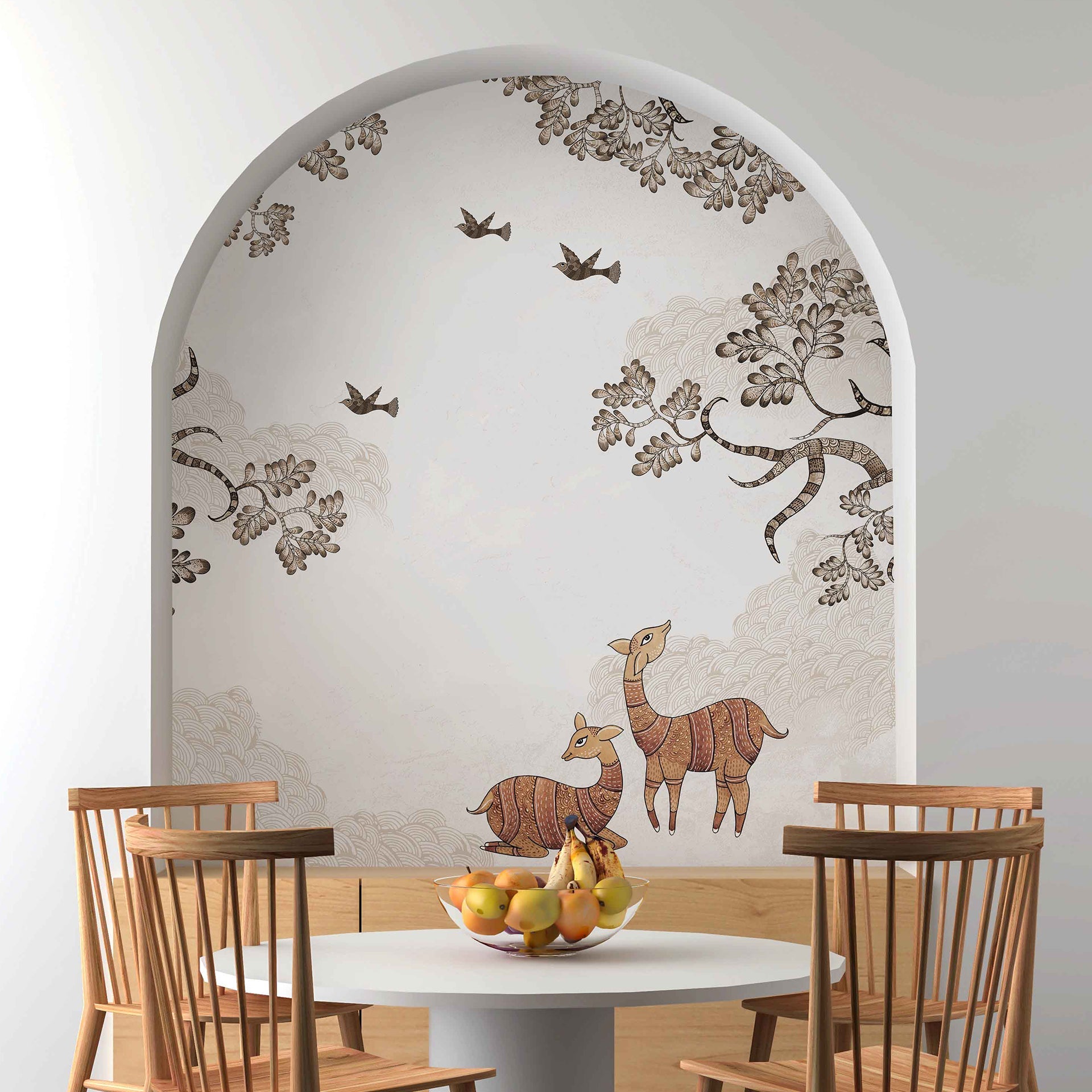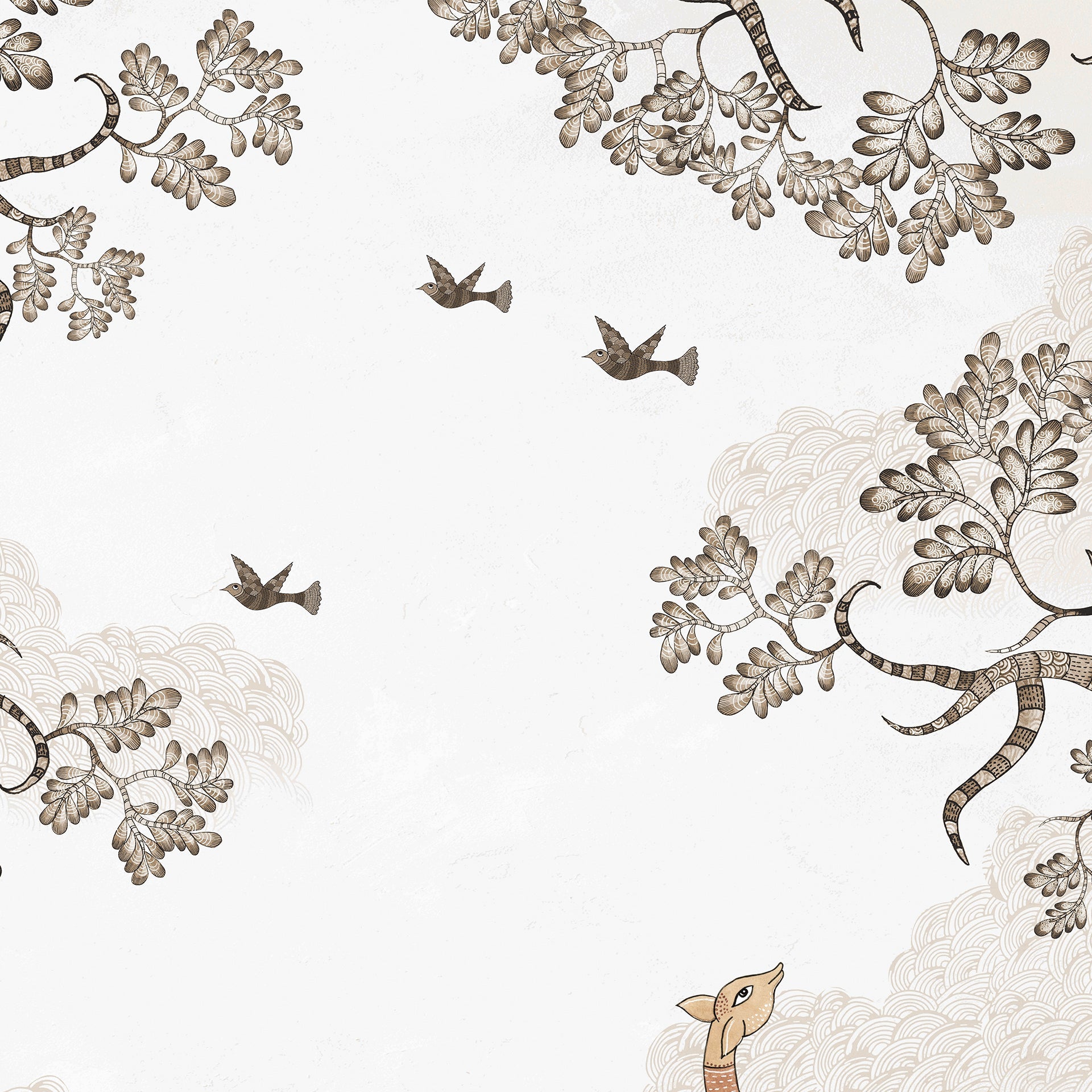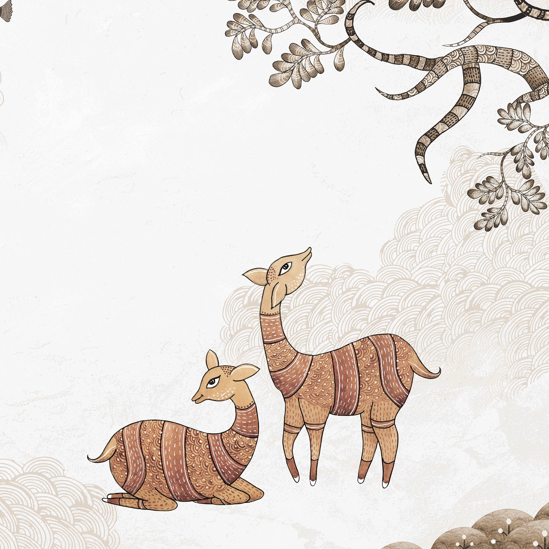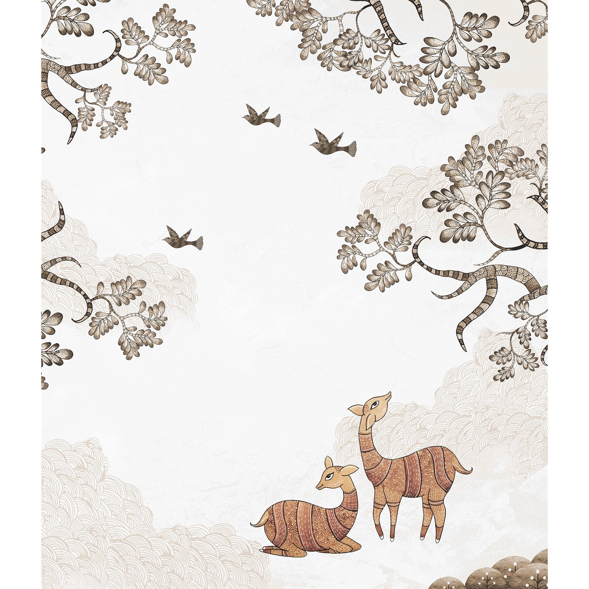 Artistic depiction of two deer in a whimsical forest landscape embellished with intricate branches and flying birds. The soft tones and detailed artistry evoke peaceful and natural harmony.