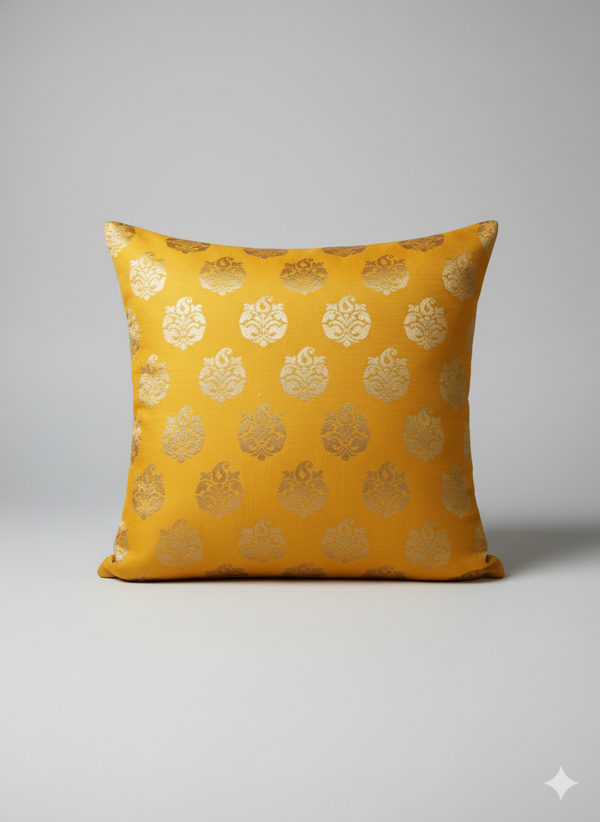 A celebration of richness and refinement, the Kanaka Mugdha collection brings together the timeless glow of traditional gold motifs with the sleek sophistication of modern silk decor. Every cushion cover pairs luminous zari-inspired prints with contemporary silhouettes, creating decor accents that feel both festive and effortlessly stylish. Whether layered into everyday living spaces or reserved for special occasions, this curation adds a touch of regal charm without overpowering the room—making heritage feel beautifully modern.
