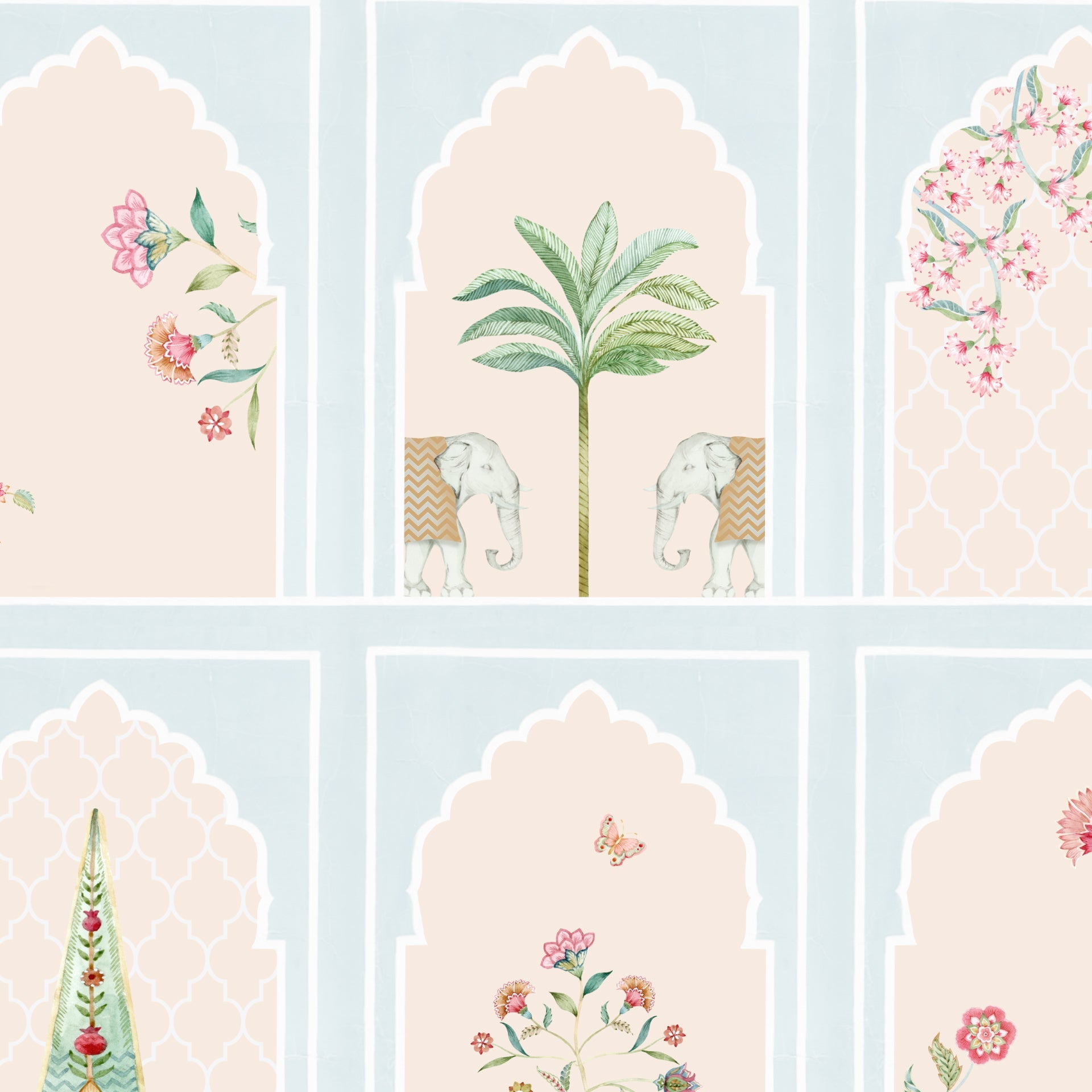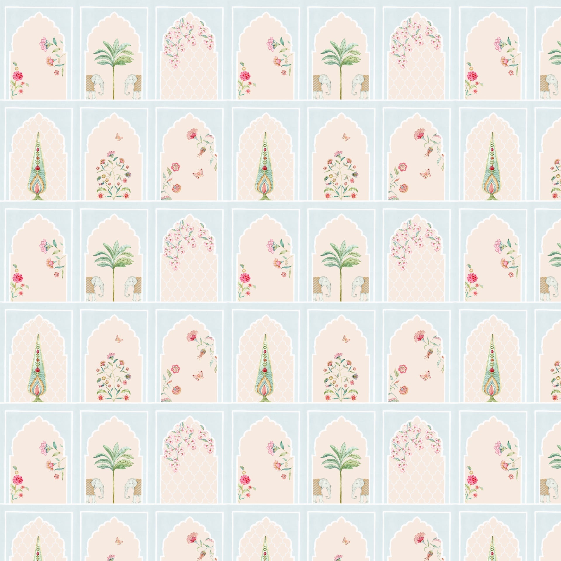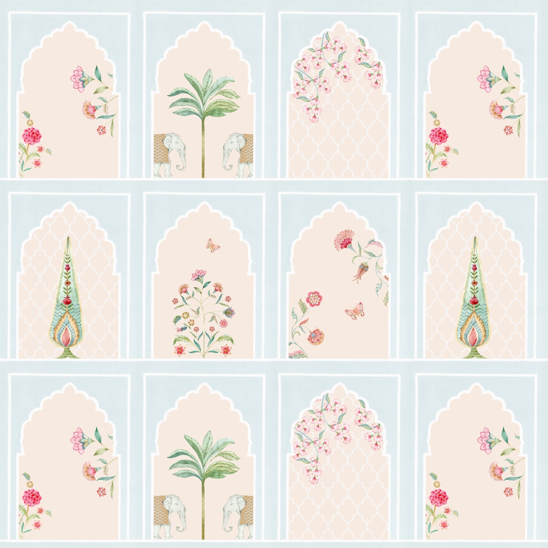 Subtle Blue Arches Wallpaper a repeating pattern of ornamental archways and decorative natural motifs. Ideal for modern living rooms or serene bedrooms, its calming blue tones and architectural elegance bring timeless charm to any space. Perfect for feature walls, large ceiling walls or full-room coverage.