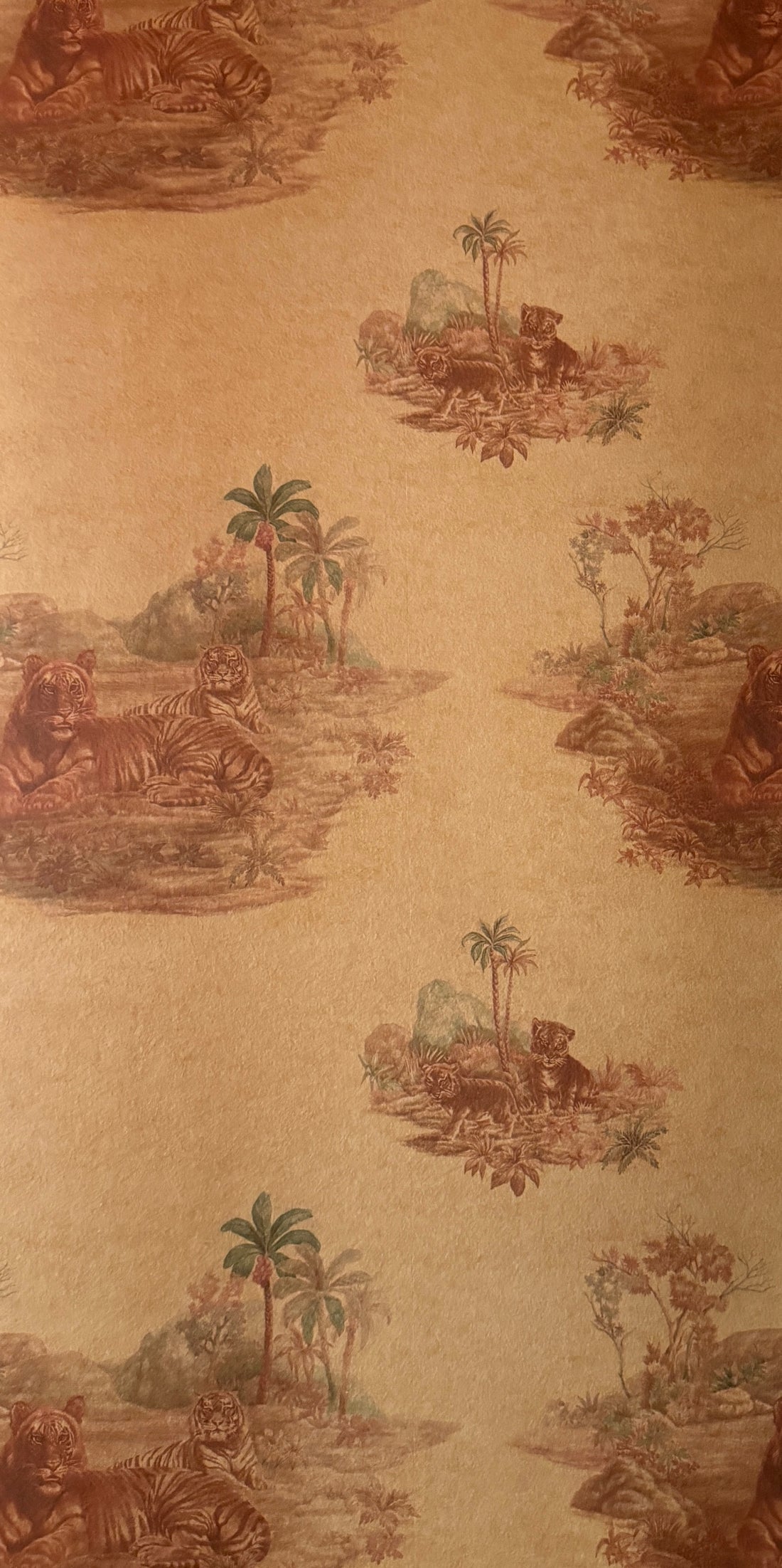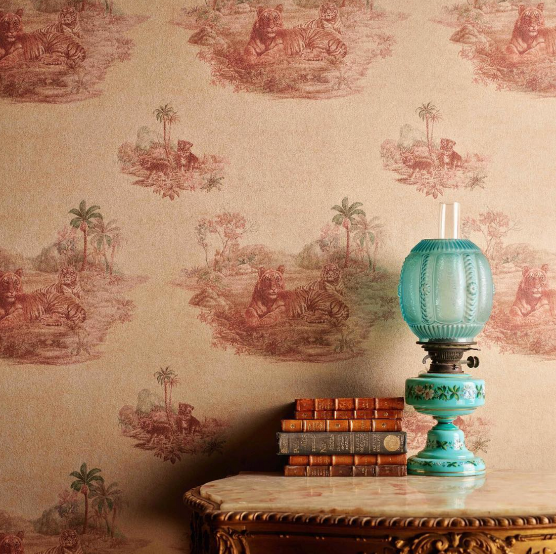 Quietly powerful and deeply evocative, Sunderbans brings the untamed beauty of the mangrove forests to your walls. With painterly illustrations of tigers at rest, gentle flora, and glimpses of hidden wildlife, the pattern unfolds like scenes from a vintage travelogue. Set against a washed parchment base, the design feels timeworn in the best way—rich in story, yet calm and grounded.