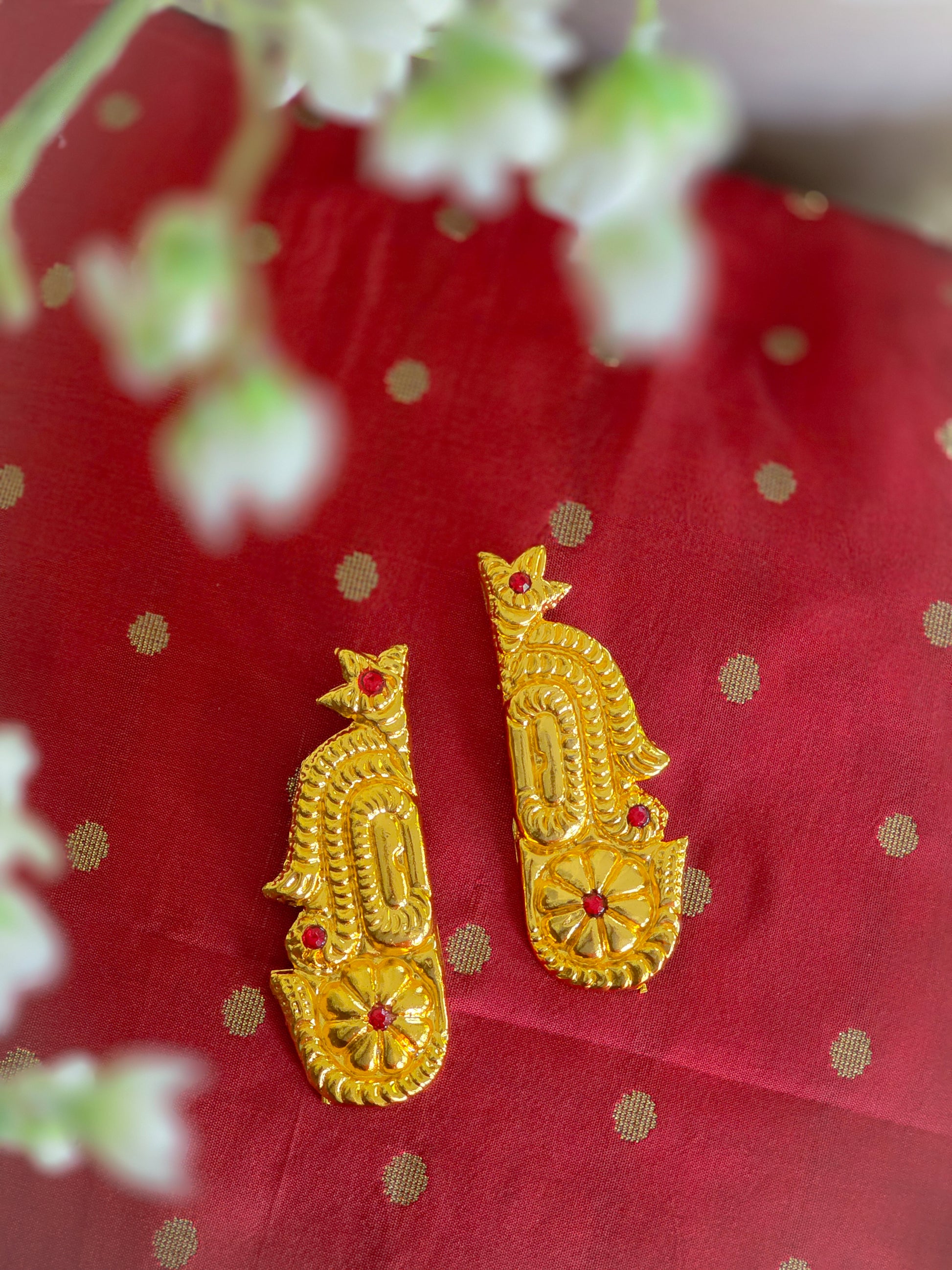 Grace your Ammavaru idol with these beautifully handcrafted earrings, inspired by traditional temple jewelry. Designed to add a divine touch, these earrings feature intricate detailing and a classic circular shape that complements any alankaram. Whether for daily pooja or festive adornment, these earrings bring timeless elegance to your sacred space.