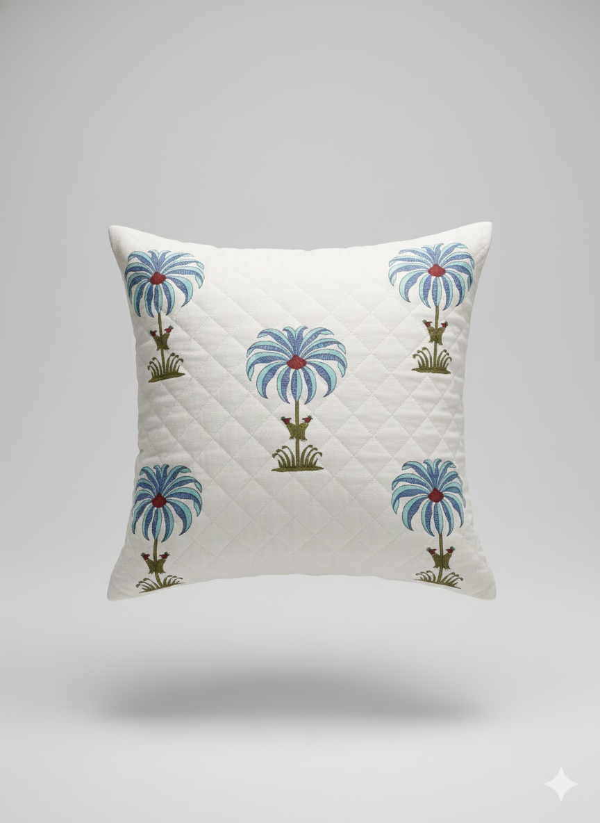 This collection brings together the calm elegance of quilted craftsmanship with motifs inspired by nature’s gentle rhythm. Set against a pristine white base, each cushion showcases delicate hand-drawn designs—soothing blue palms on one and soft pink florals on the other. The blend of subtle texture, pastel hues, and traditional botanical detailing creates a look that is both serene and timeless. Perfect for adding a fresh, airy charm to contemporary spaces while honoring the grace of heritage-inspired art.