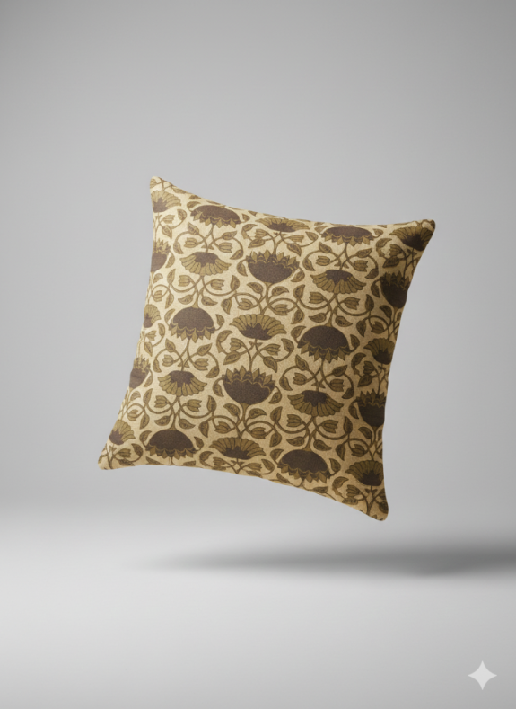 This cushion cover blends earthy elegance with a timeless heritage touch. The pattern features repeating lotus motifs rendered in deep brown against a warm beige backdrop, creating a soothing, vintage-inspired aesthetic. The design carries the charm of hand-block traditions while maintaining a modern understated look—perfect for spaces that appreciate subtle artistry.