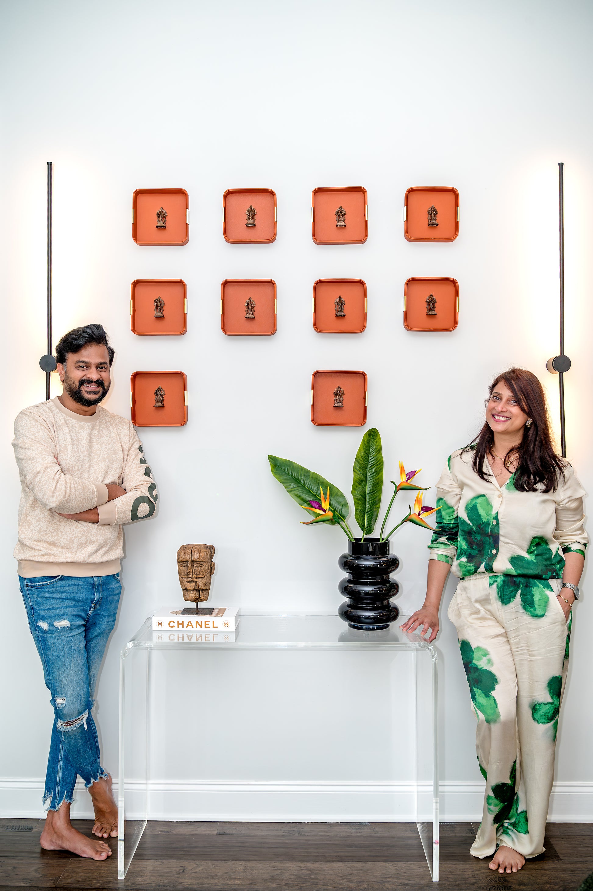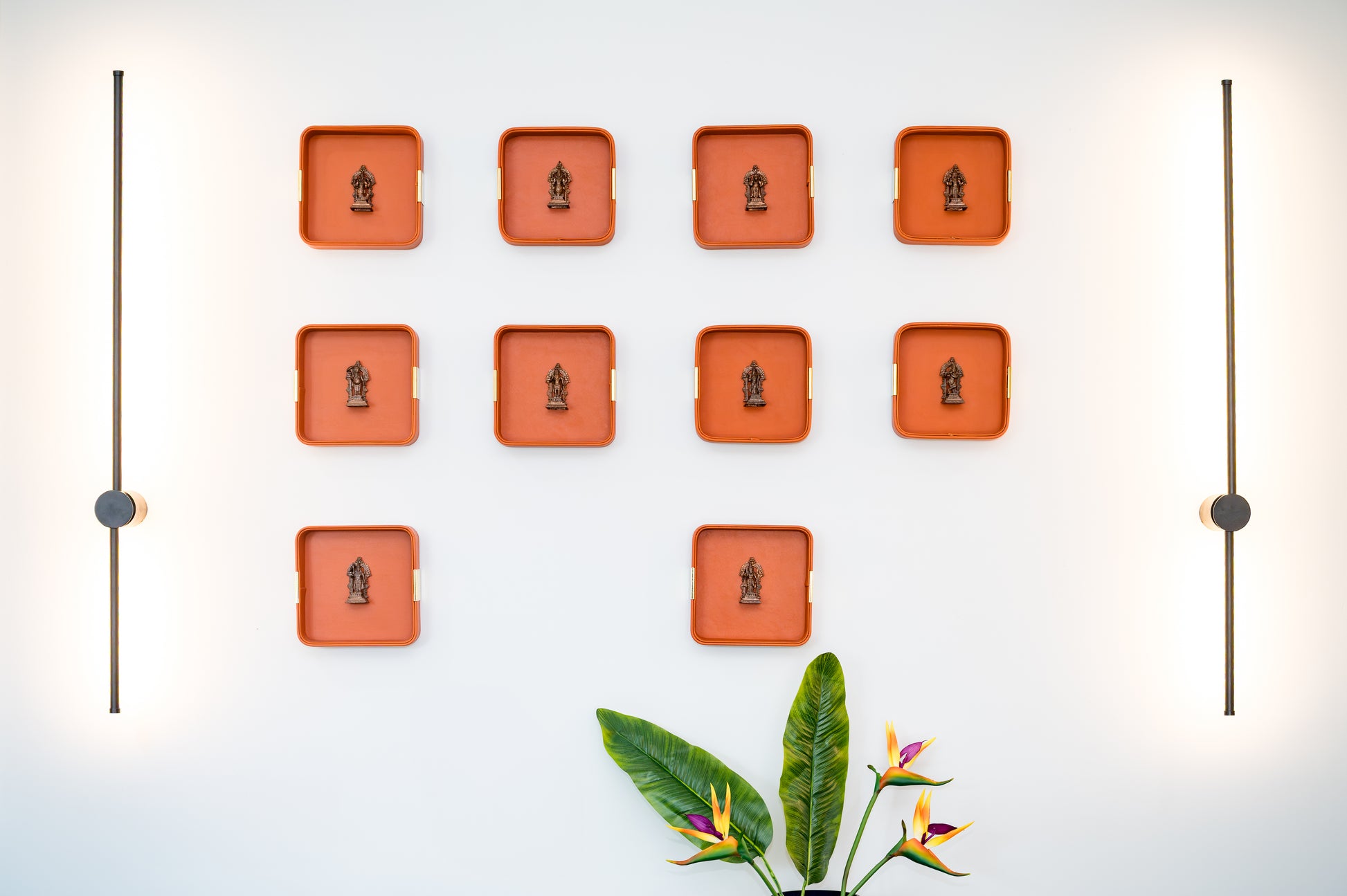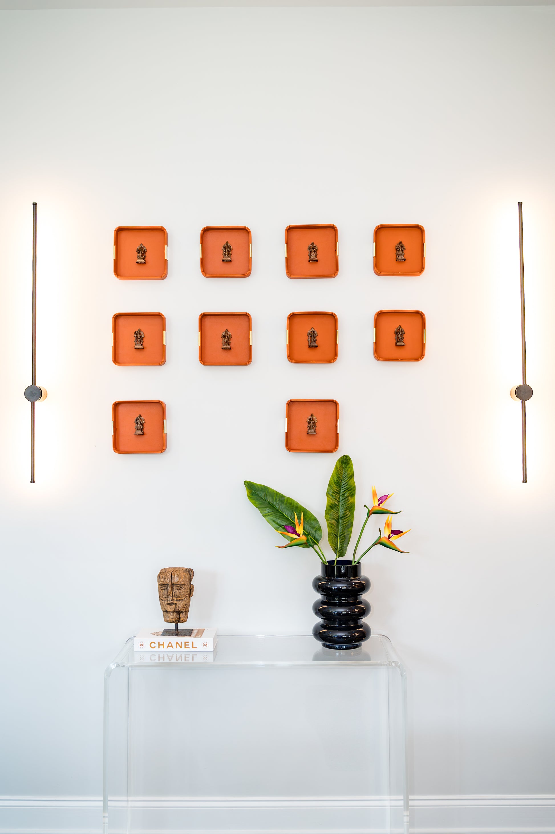 Bring divinity and design together with this modern take on sacred storytelling. Featuring the Ten Avatars of Vishnu (Dasavatara), each miniature brass idol is individually mounted on a hand-crafted terracotta-toned leather frame and accented with sleek brass detailing. Perfectly aligned in a grid, this installation bridges traditional Indian iconography with clean, contemporary aesthetics.