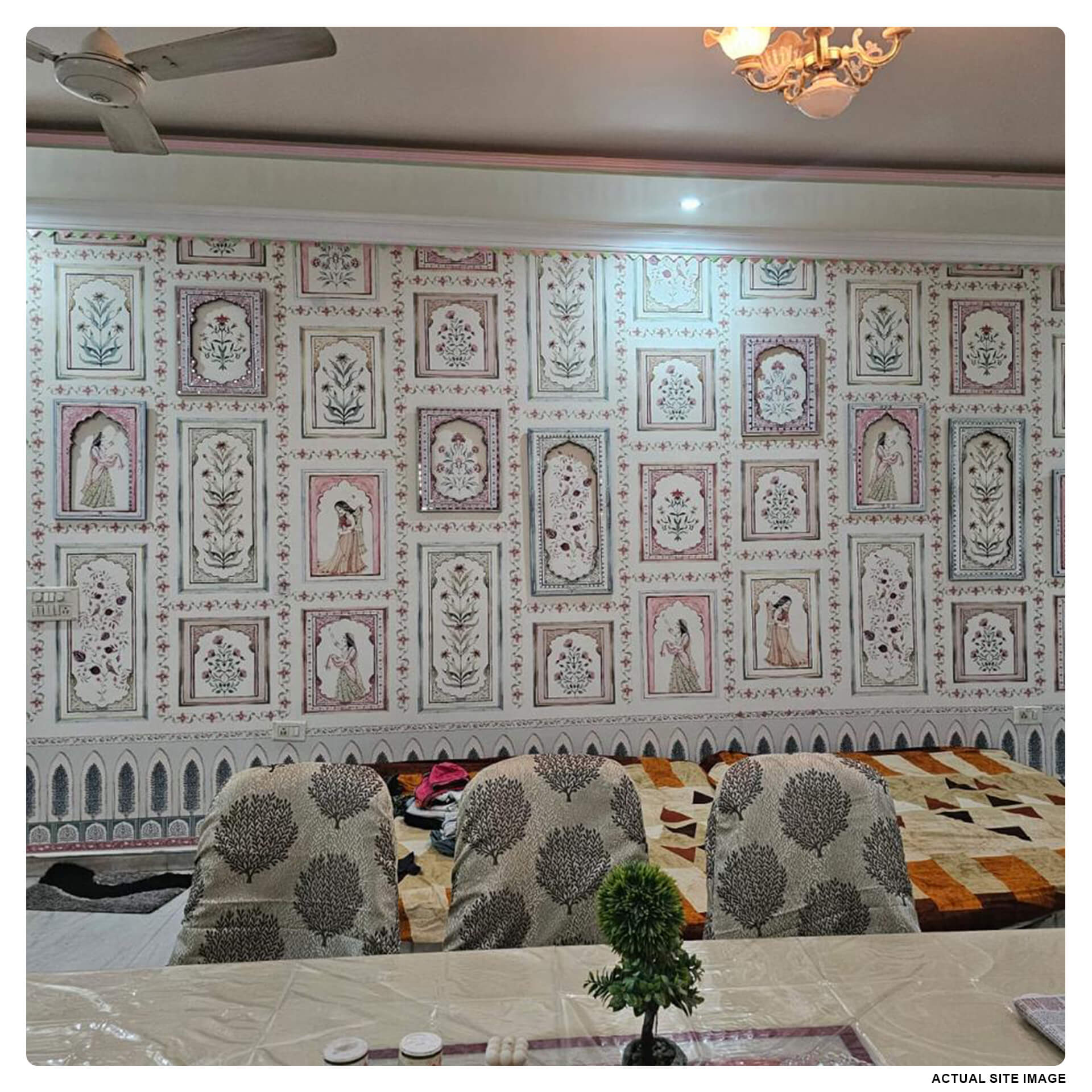 The wallpaper comes in tiles/panels ranging from 36 to 52 inches in width and must be placed horizontally to create a seamless pattern on floor before pasting on the wall.