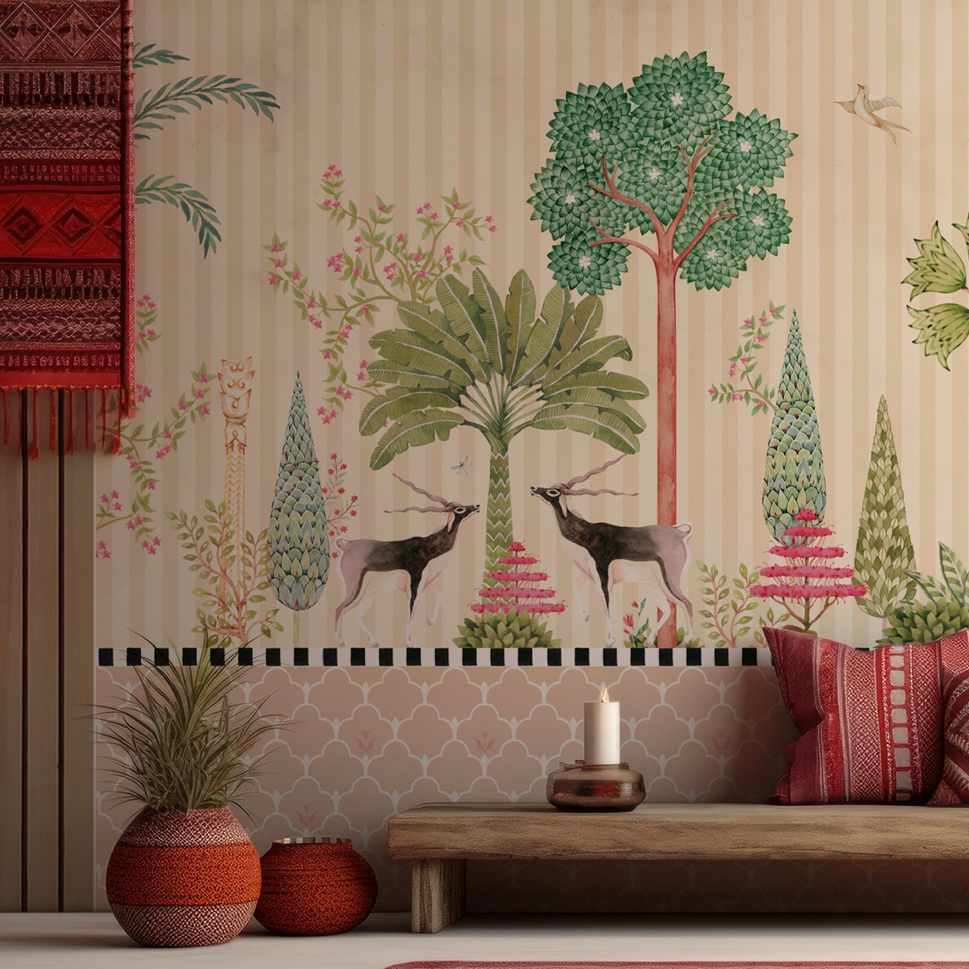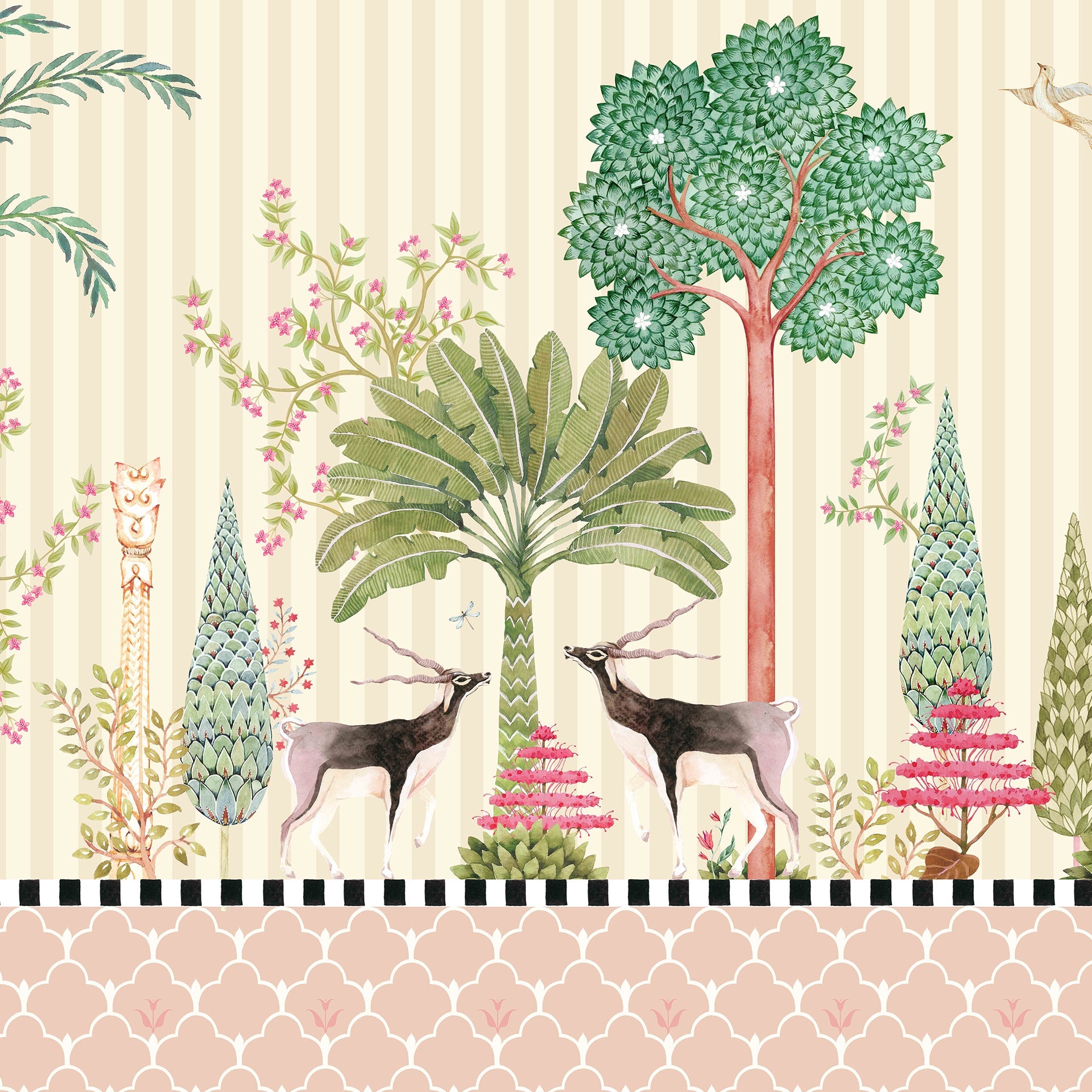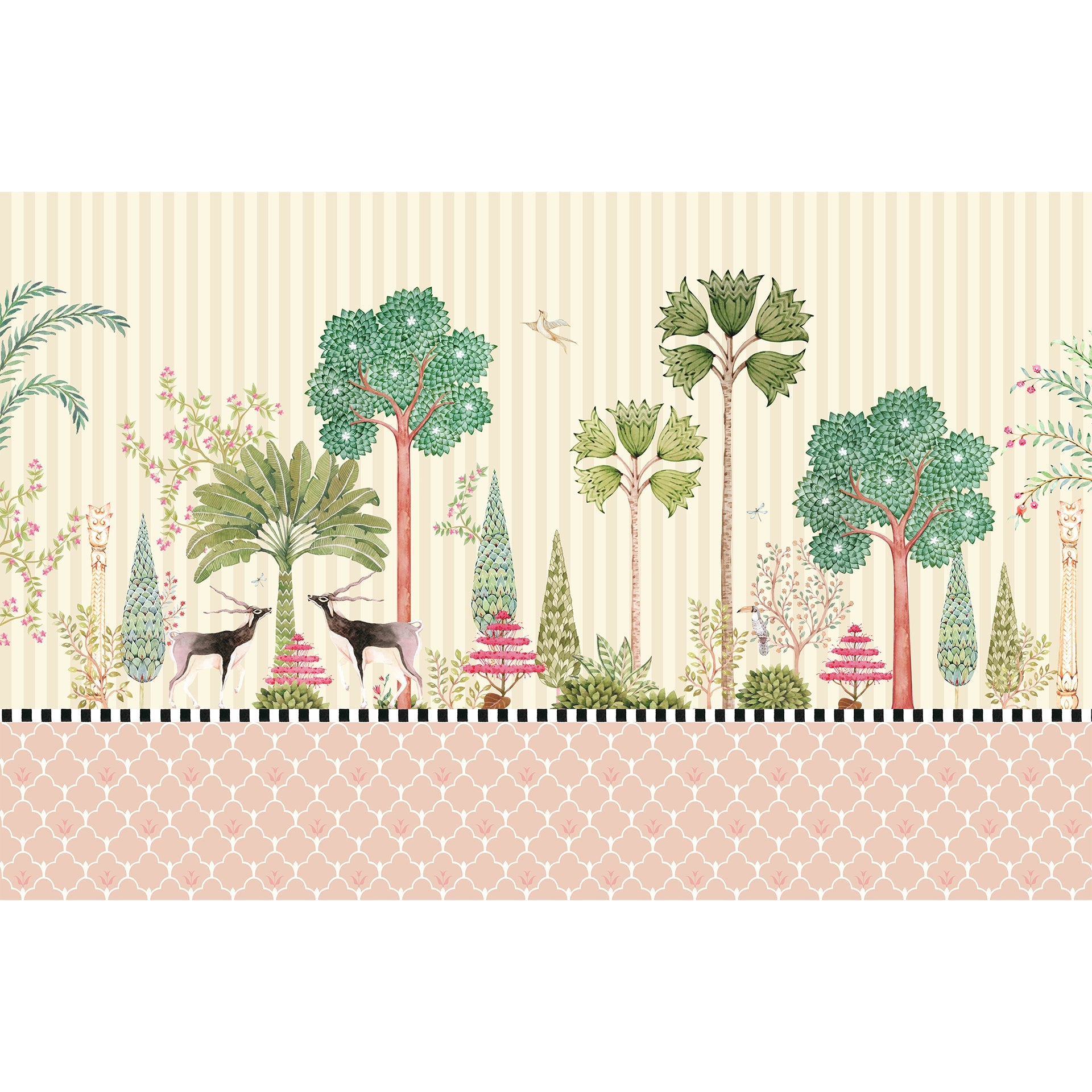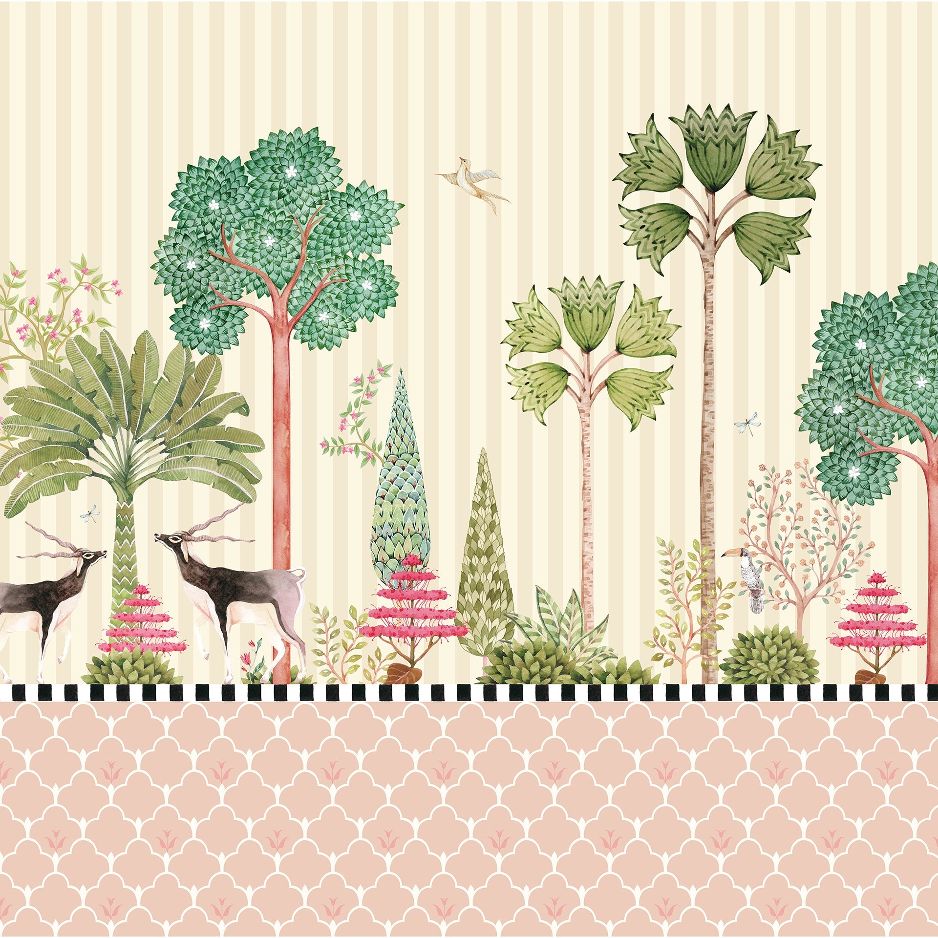 Bring nature's quiet poetry to your walls with this decorative jungle wallpaper, featuring a serene tableau of blackbucks standing gracefully among exotic trees and blooming shrubs. Birds and dragonflies flit through the foliage, while hand-drawn textures and a soft striped backdrop add layers of charm and detail. This artwork-inspired design offers a refined yet playful aesthetic, ideal for living rooms, nurseries, reading corners, or boutique-style spaces.