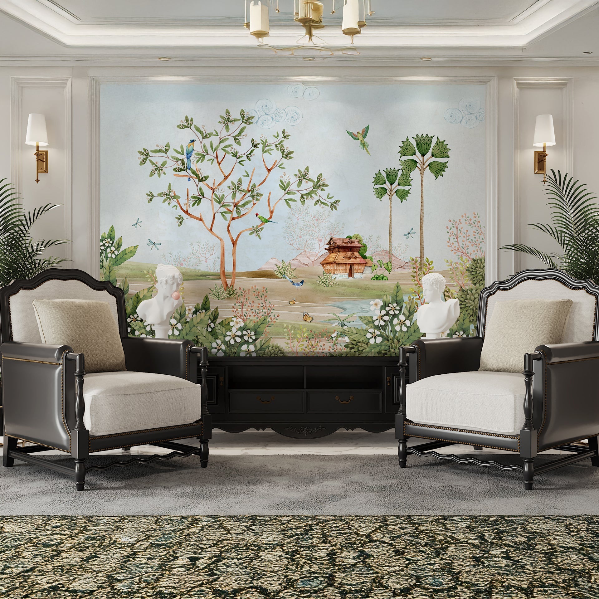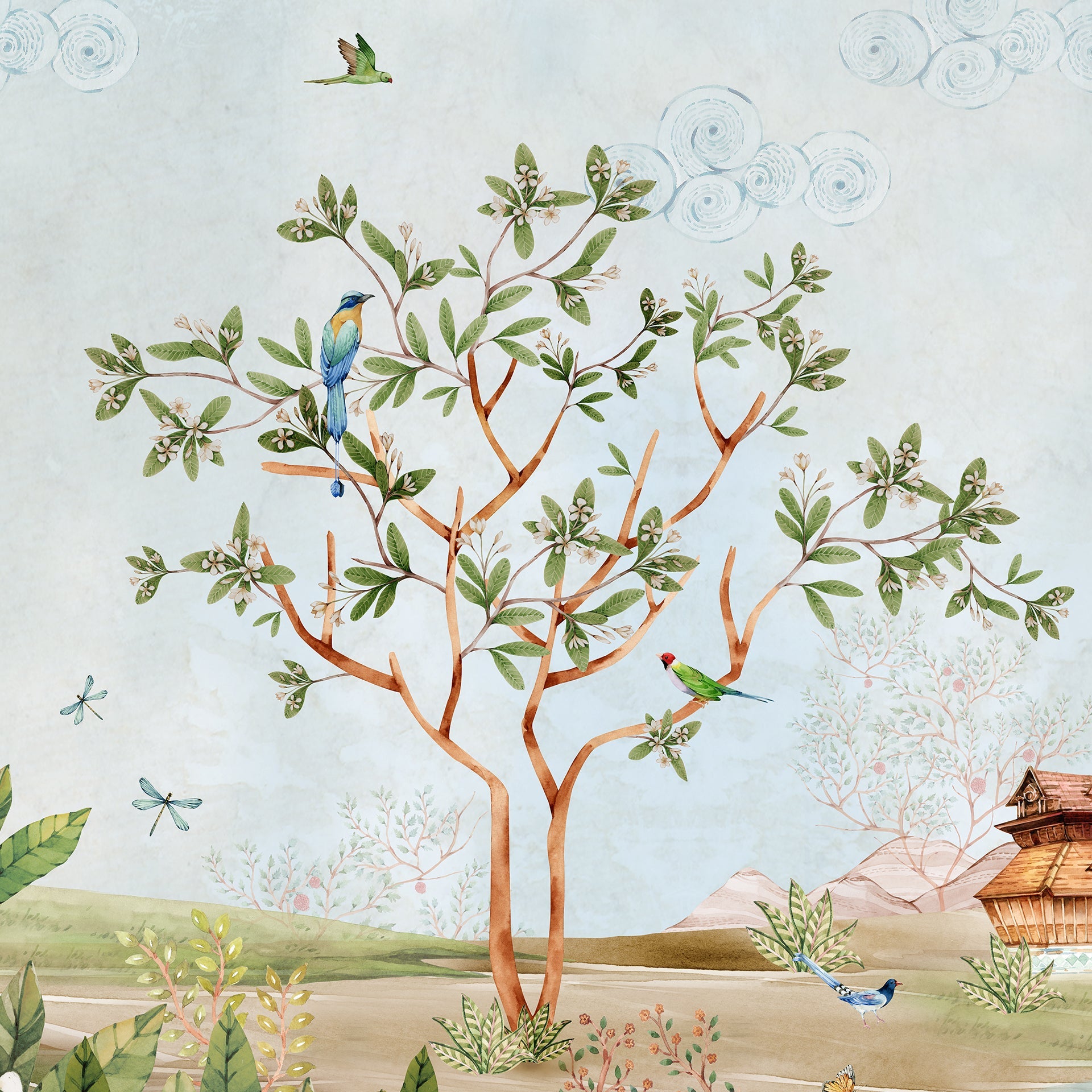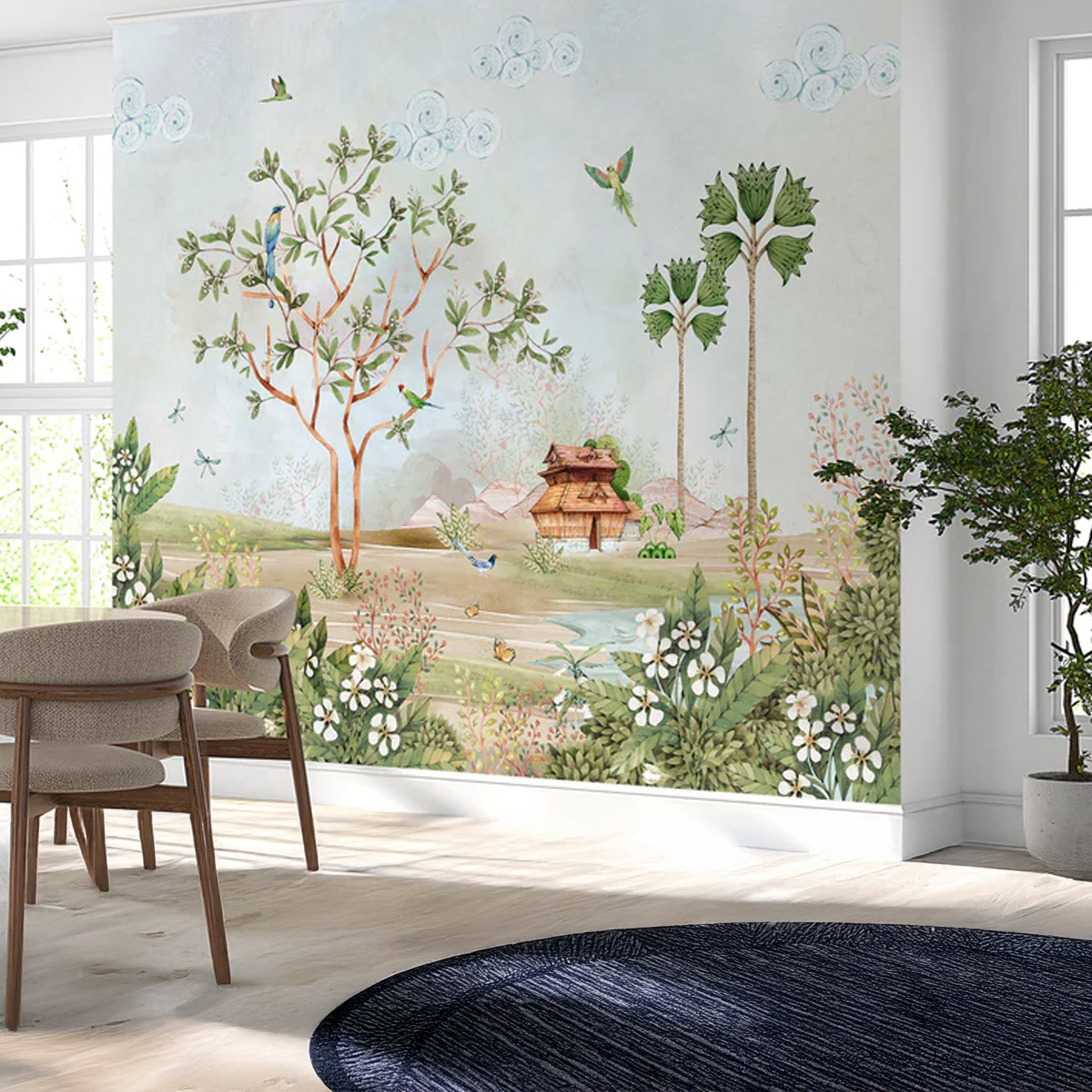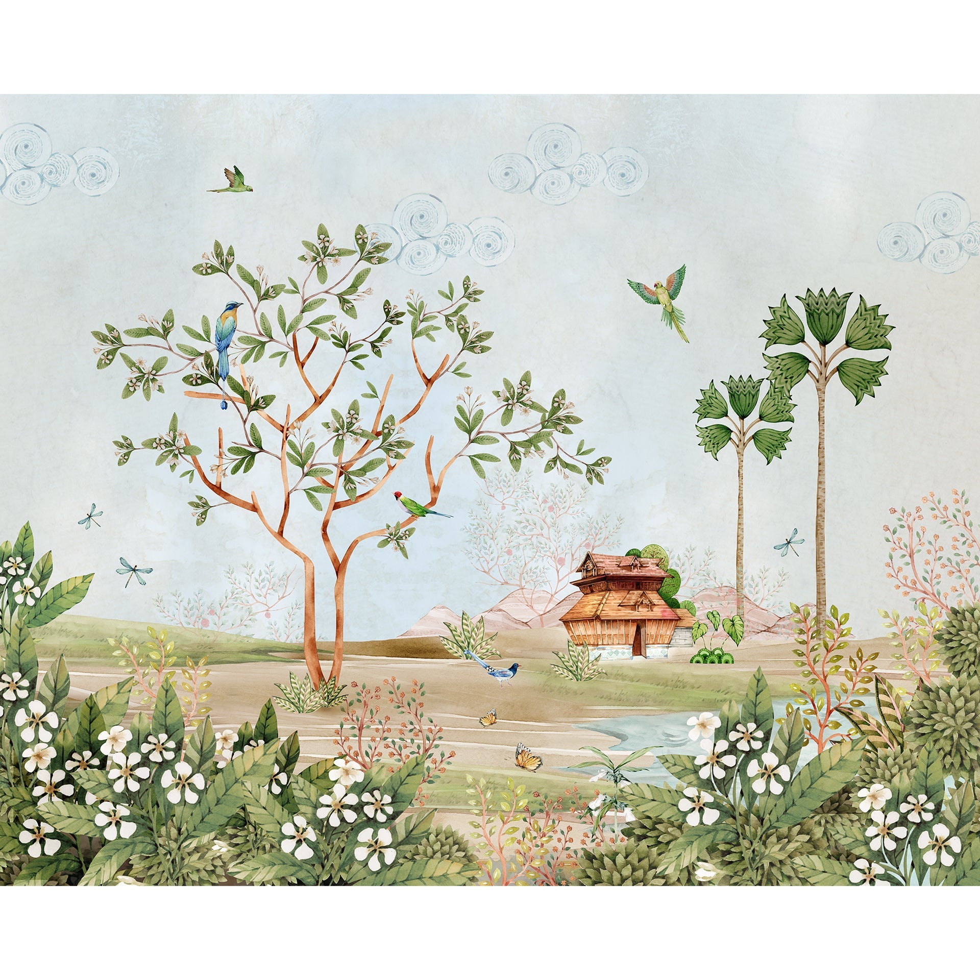 Traditional Balinese Countryside Landscape Wallpaper with Tree Motifs & Birds, this design reflects the peaceful charm of Bali’s rural beauty. Ideal for living rooms or meditation corners, it blends traditional tropical aesthetics with artistic elegance.