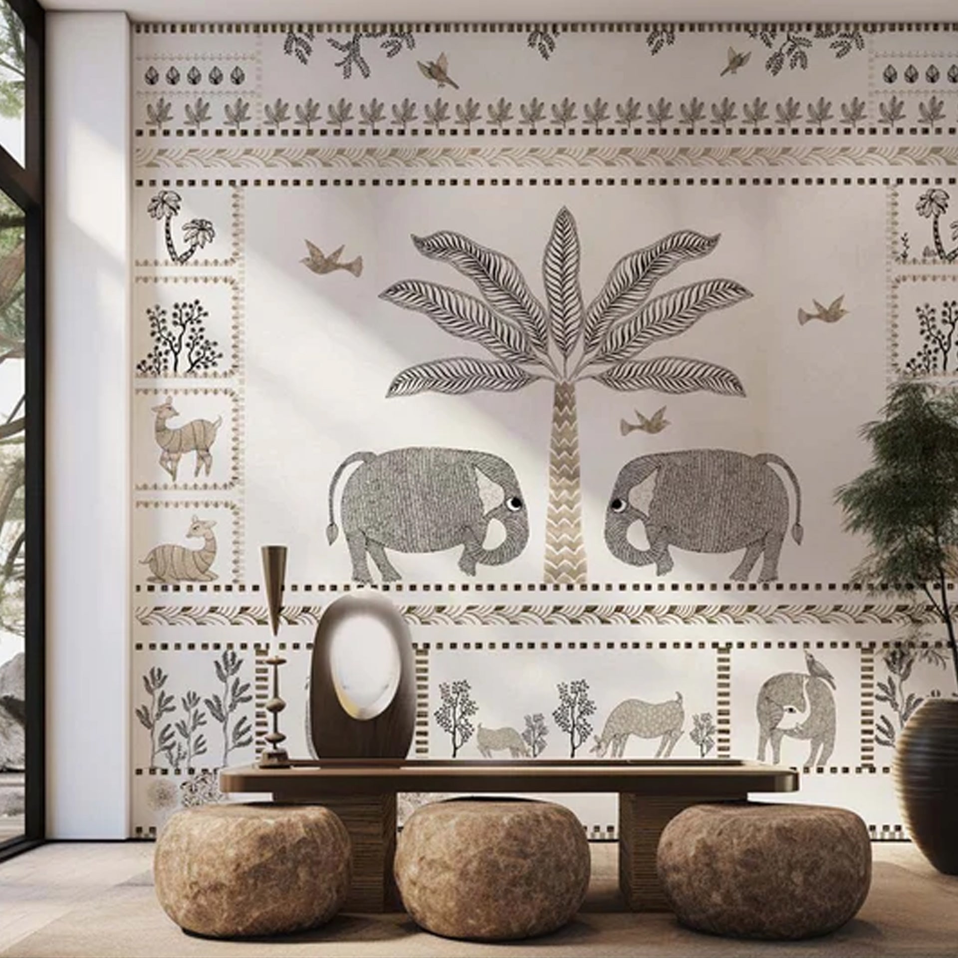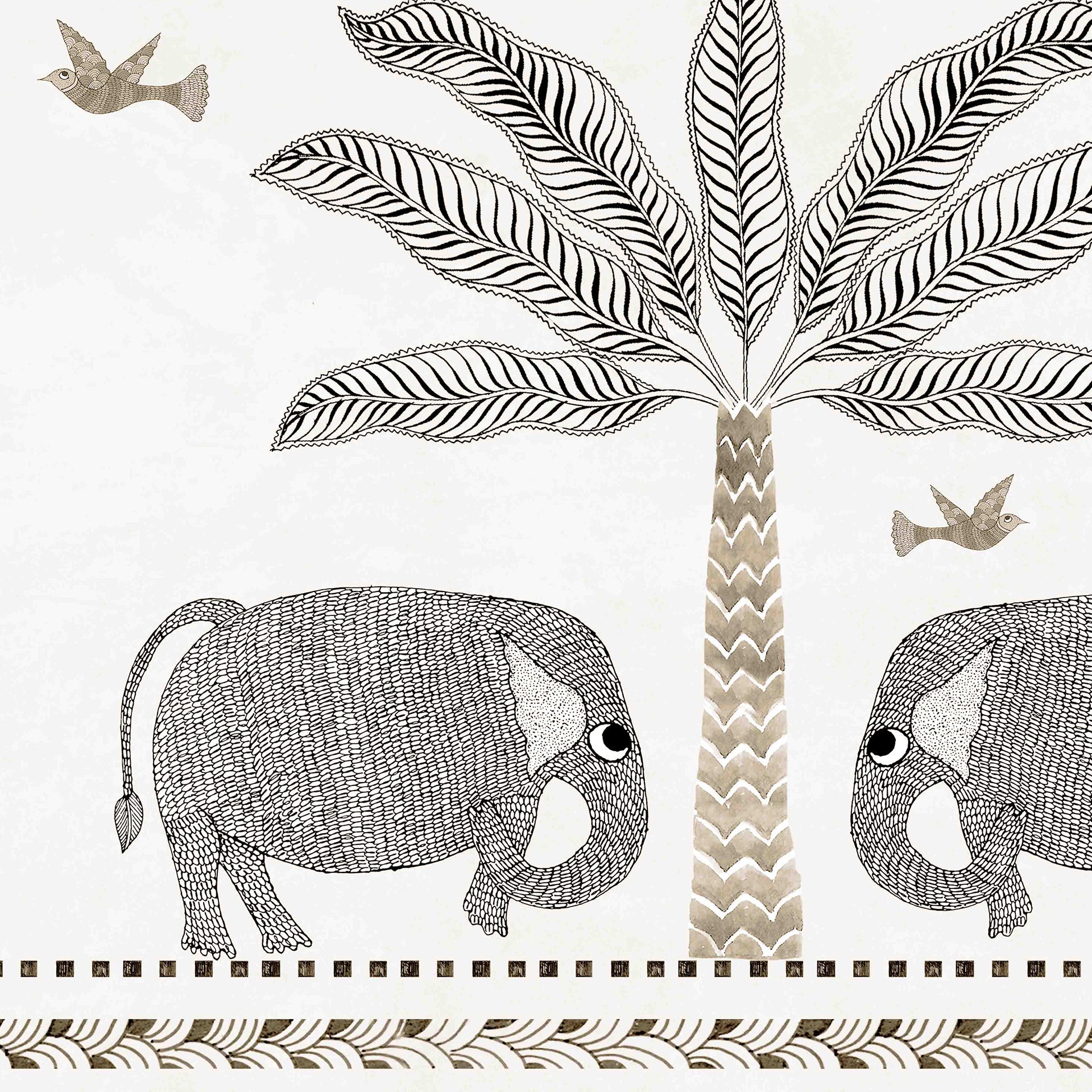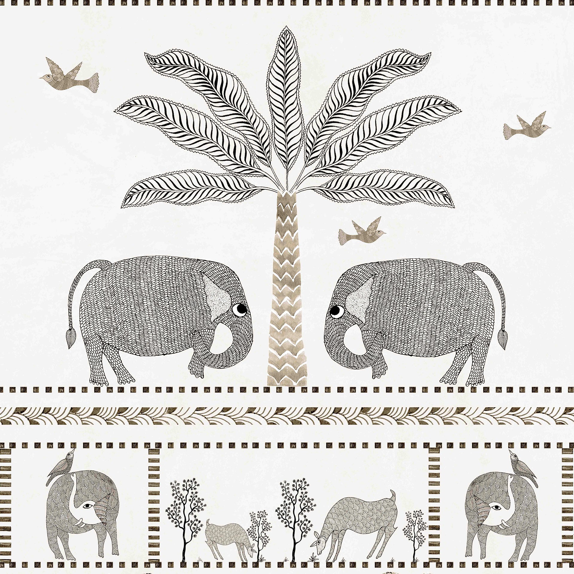 Highly detailed illustration of elephants, palm tree, and animals in a tribal and tropical decorative design. Perfect for textiles, crafts, and projects with a unique artistic flair.