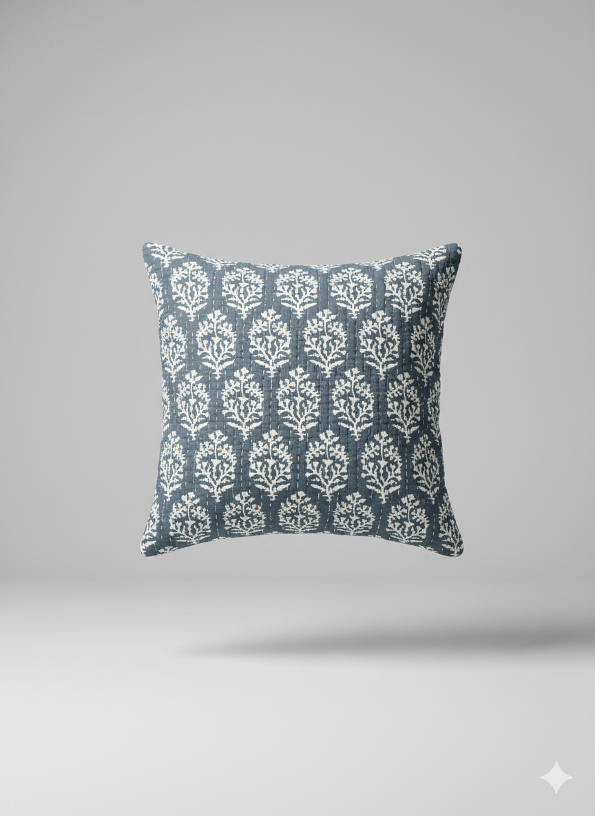 Pallavita Dharavali brings a calm, earthy elegance to contemporary décor through its harmonious arrangement of botanical motifs. The soft smokey-grey base is adorned with repeating ivory tree-inspired prints, creating a balanced and soothing visual flow. The design draws from traditional block-print aesthetics, yet its muted palette gives it a refined, modern feel—perfect for homes that embrace simplicity, nature, and quiet sophistication.