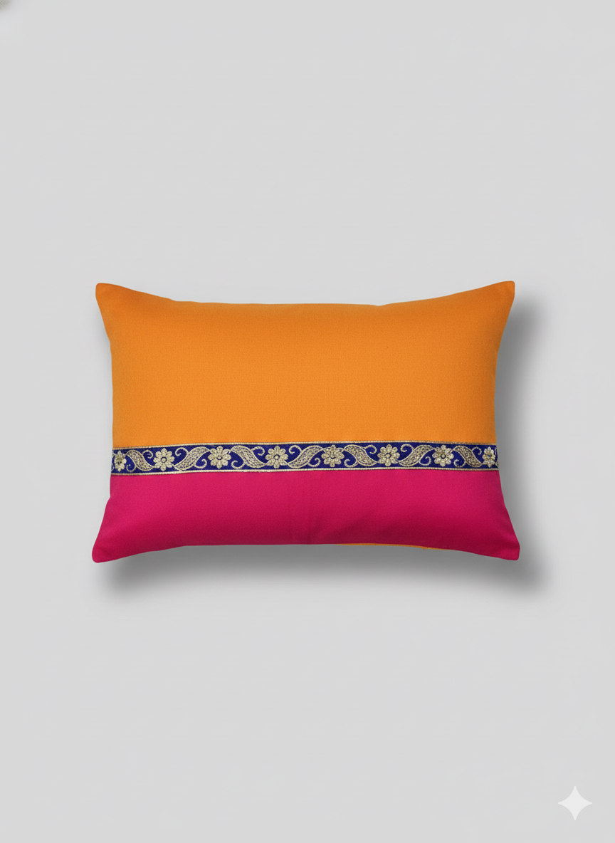 A vibrant fusion of heritage tones and modern simplicity, this cushion cover brings festive charm to contemporary décor. The bold combination of marigold orange and deep pink is elegantly tied together with a royal blue embroidered border, inspired by traditional zari motifs. Its clean, minimal layout gives it a refreshing modern appeal, while the colors and detailing keep it deeply rooted in cultural aesthetics—perfect for adding a joyful, celebratory touch to any space.