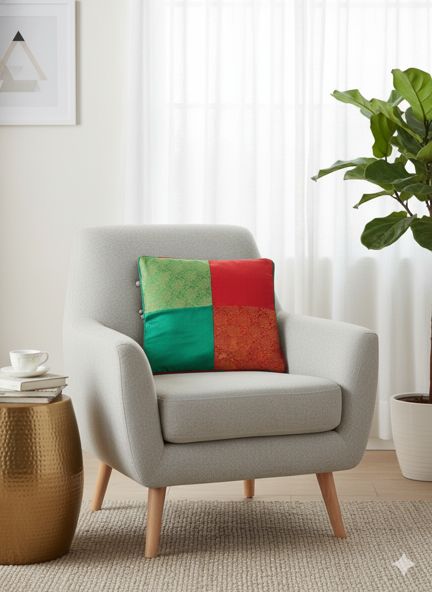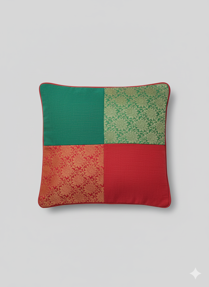 A harmony of old-world textiles and modern design, this brocade cushion collection brings the beauty of traditional silk weaves into contemporary living. Inspired by festive pattu borders and vintage zari motifs, each cushion blends jewel-toned fabrics with crisp patchwork layouts that feel both nostalgic and stylish. The shimmering threads echo heritage craftsmanship, while the bold color play and clean geometry make them effortlessly at home in today’s interiors — a vibrant fusion of culture, comfort, and modern aesthetics.