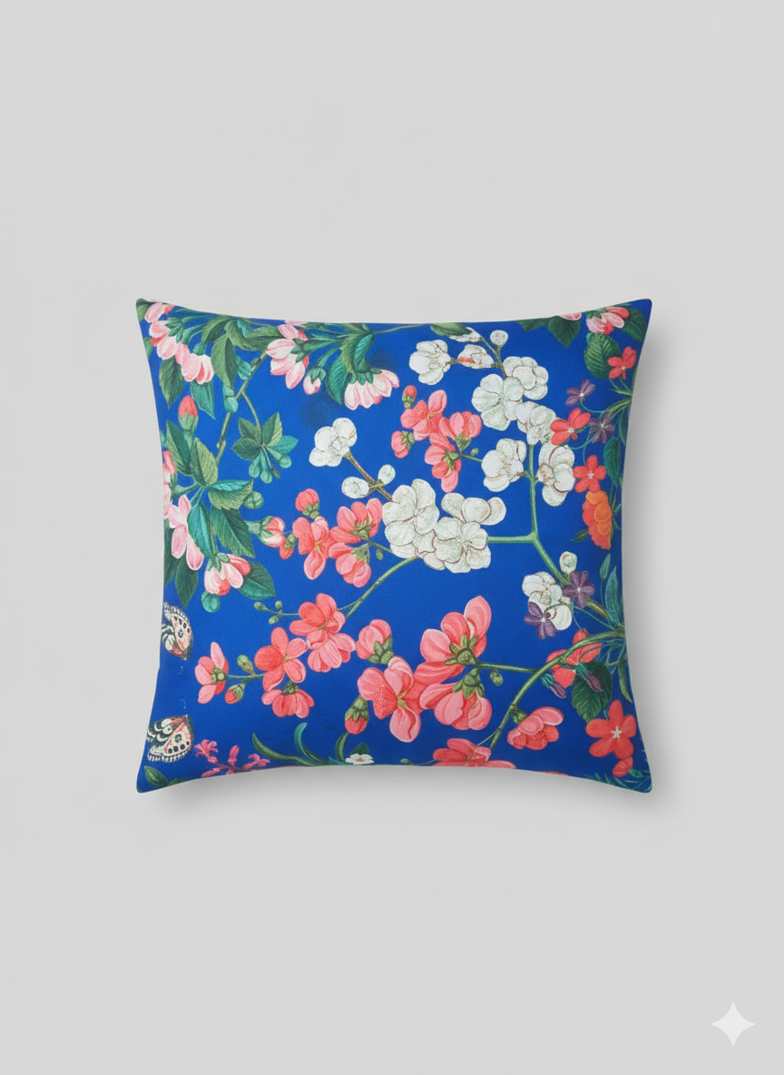 The Vasantavali collection captures the poetry of spring in every thread—where heritage floral artistry meets the vibrance of contemporary living. Inspired by age-old Indian botanical illustrations and the lush hues of blooming gardens, these cushions carry a tapestry of delicate blossoms, fluttering petals, and joyful colors. Their turquoise and royal blue backdrops echo the serenity of clear skies, while the vivid pinks, whites, and greens breathe life into modern spaces. Designed to feel both nostalgic and refreshingly current, this ensemble brings the elegance of classical motifs into homes that celebrate color, comfort, and creativity.