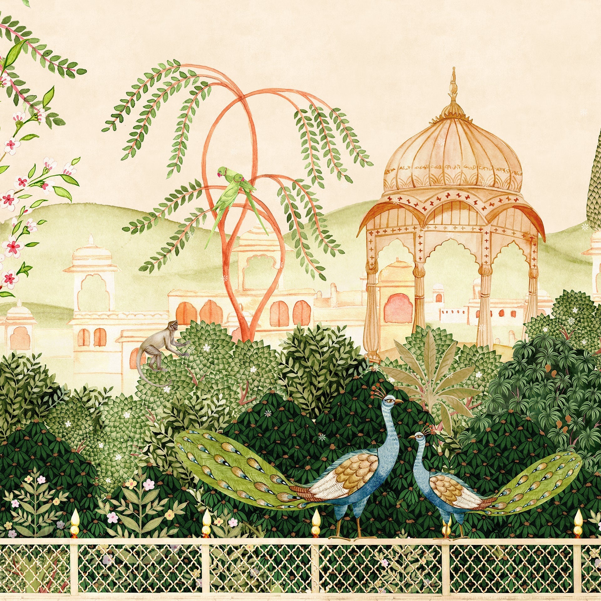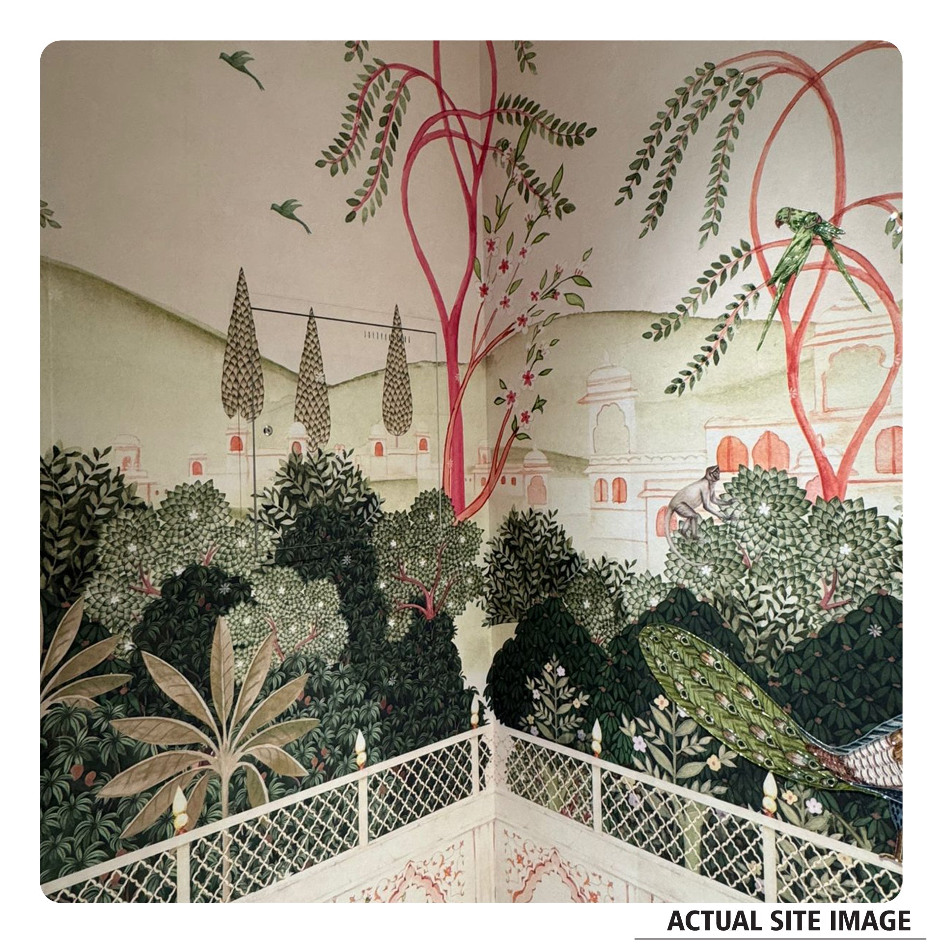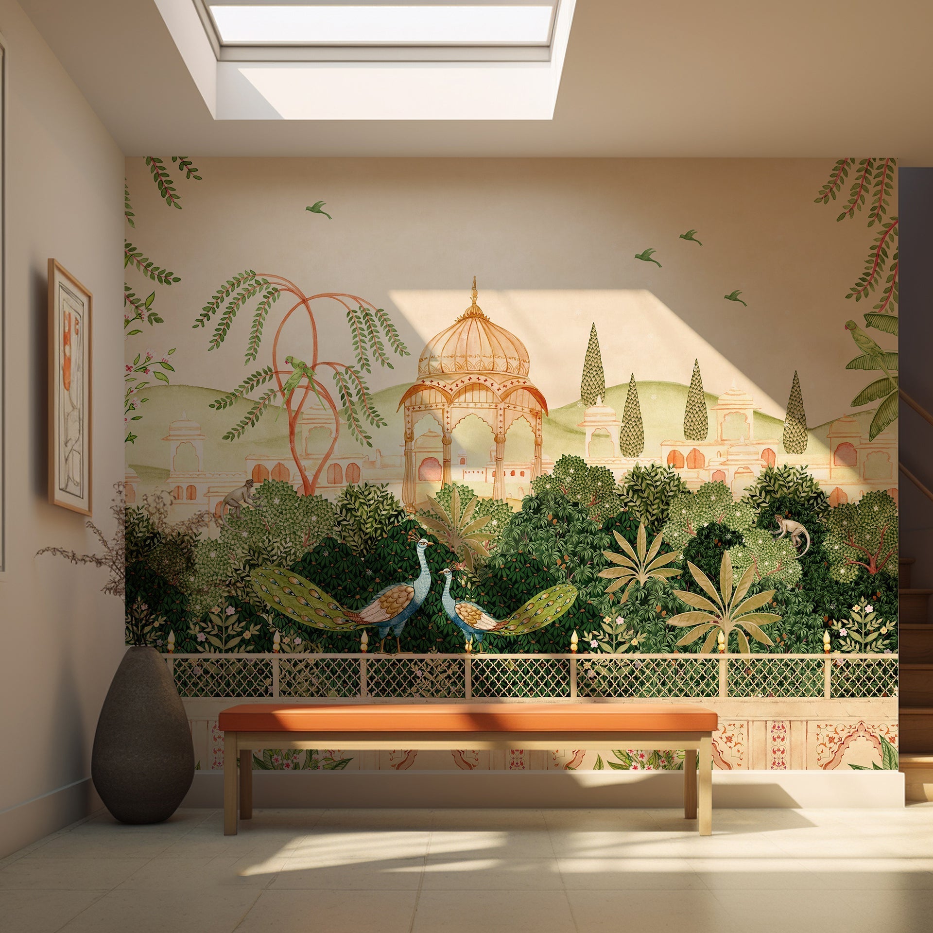 Pichwai Vrindavan Palace wallpaper with peacock and parrots adds a royal charm to any space. This vrindavan inspired pichwai wall art is best for living room, bedroom, guestroom or Pooja space.