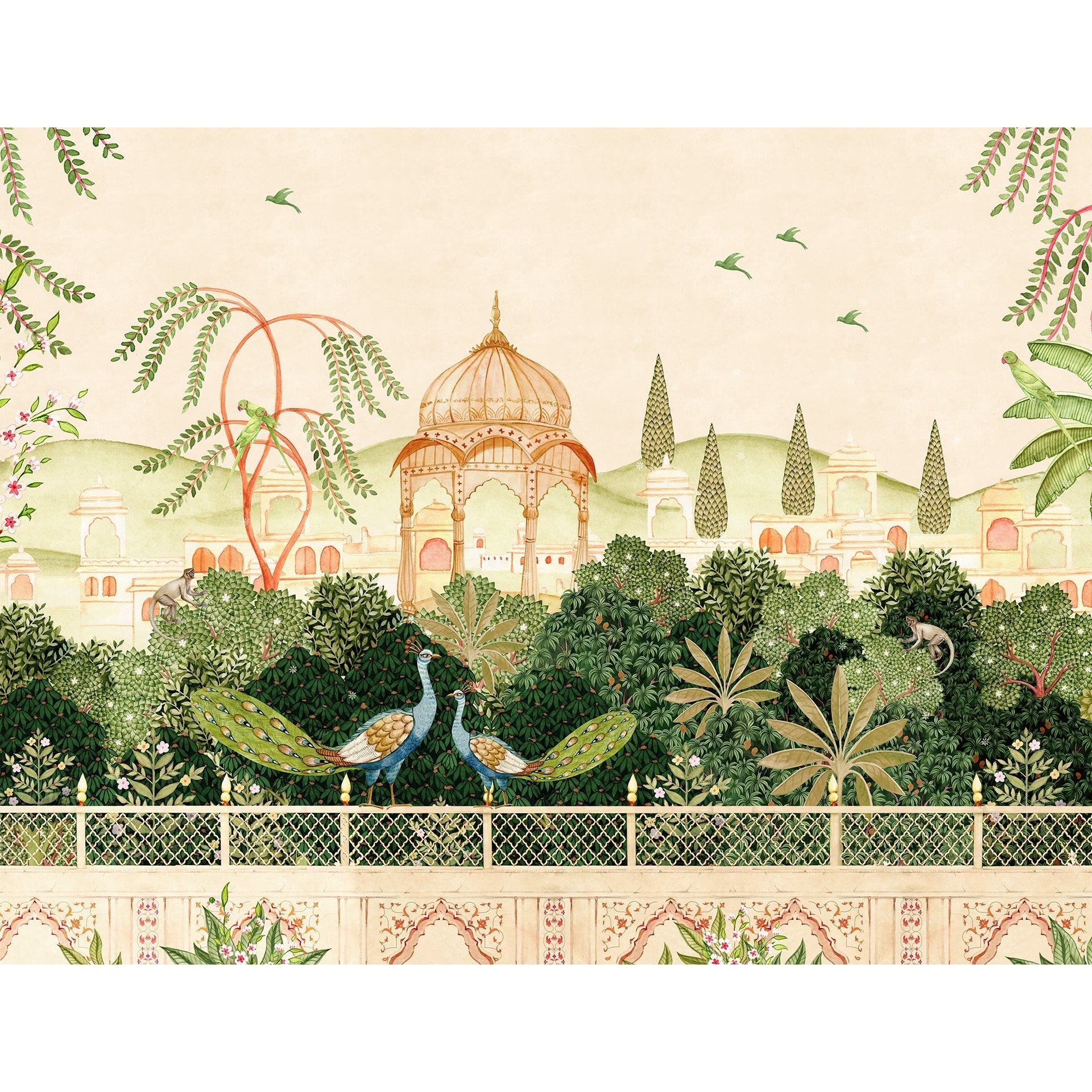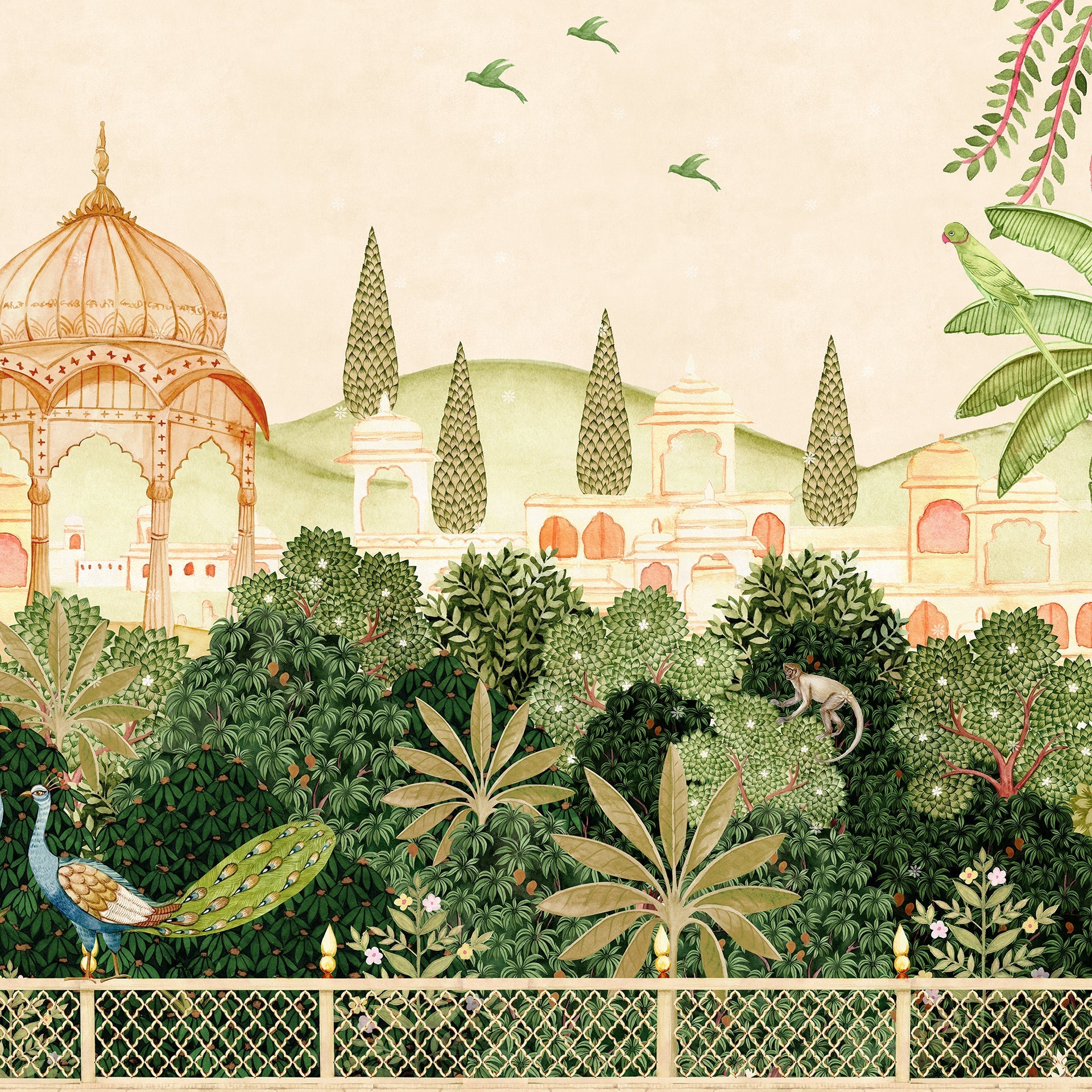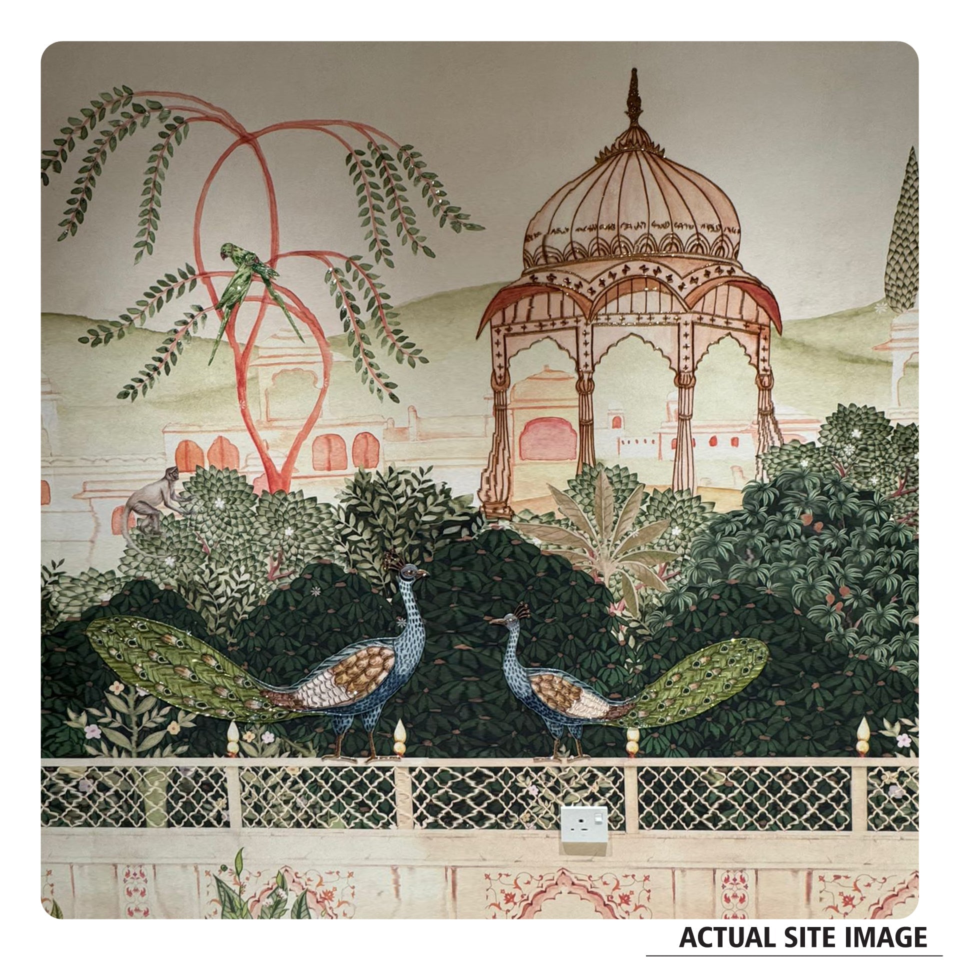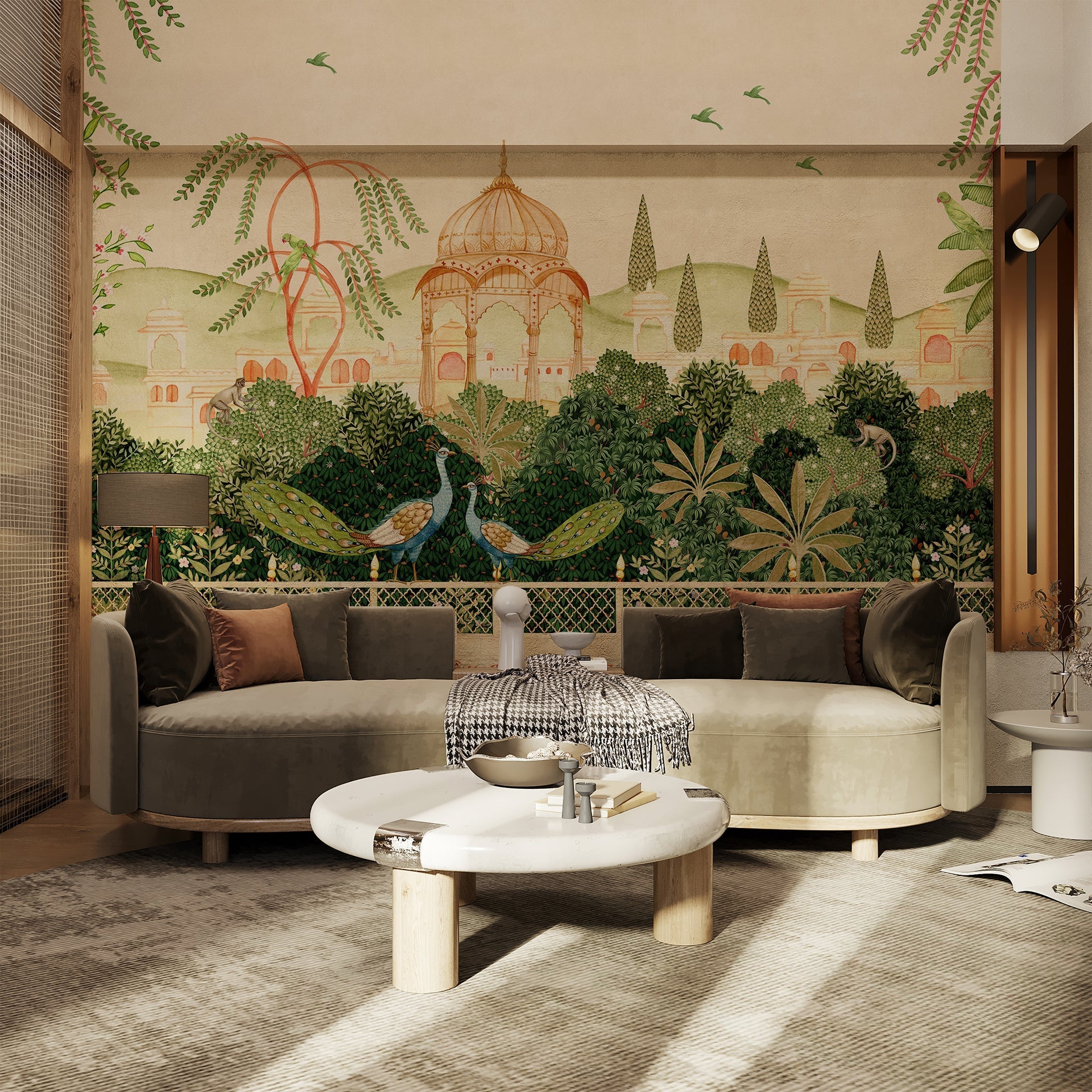 Pichwai Vrindavan Palace wallpaper with peacock and parrots adds a royal charm to any space. This vrindavan inspired pichwai wall art is best for living room, bedroom, guestroom or Pooja space.
