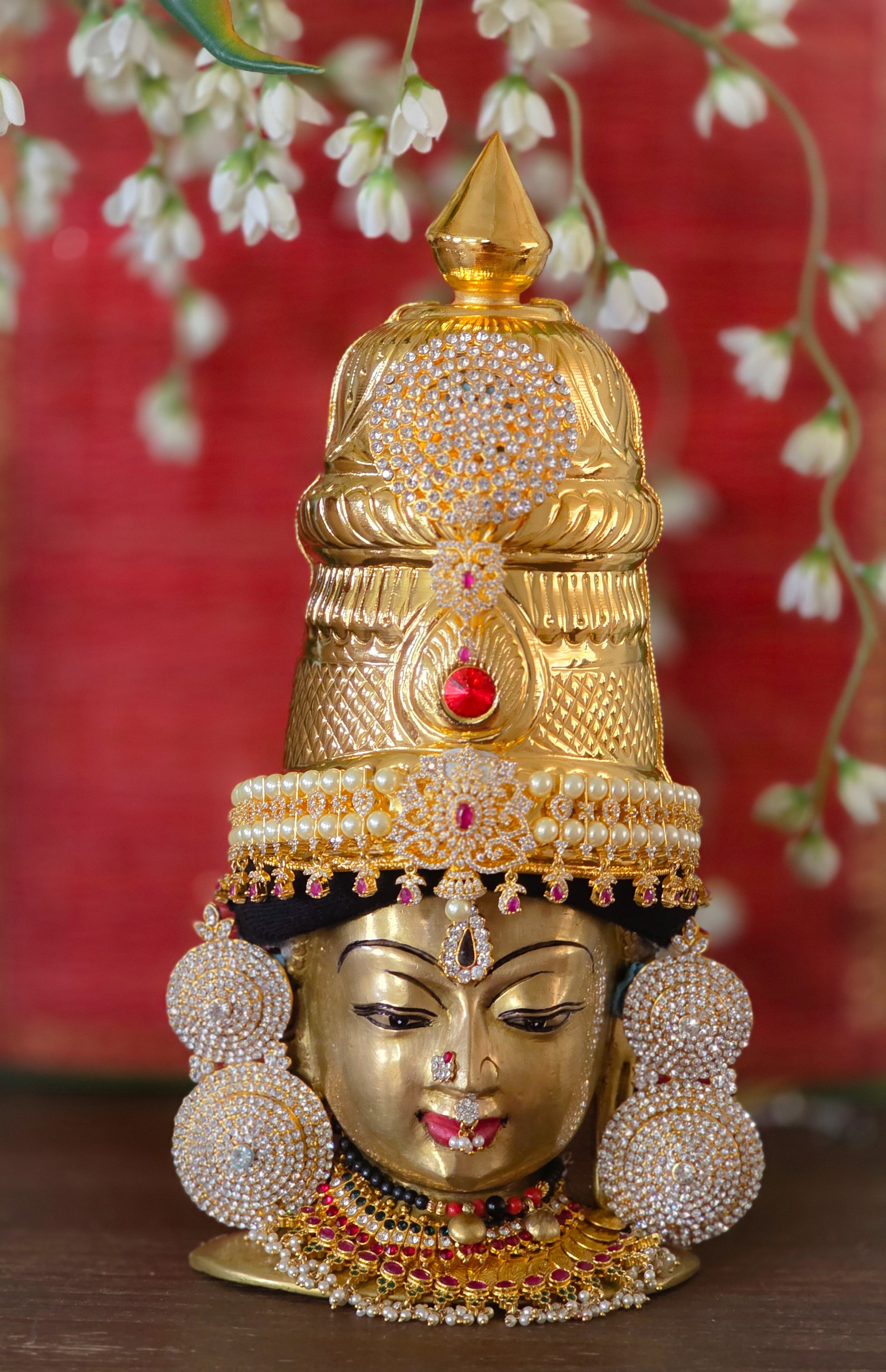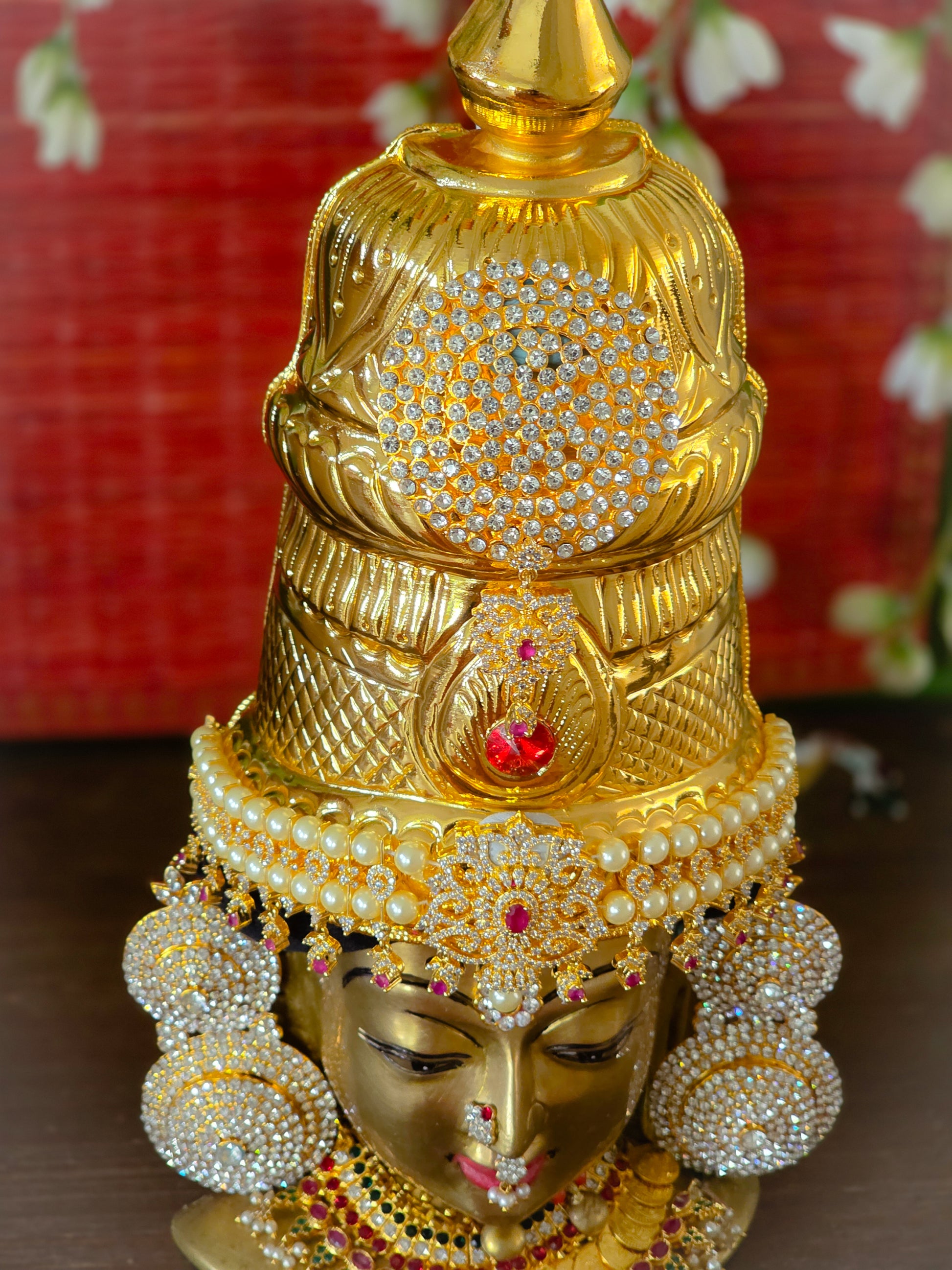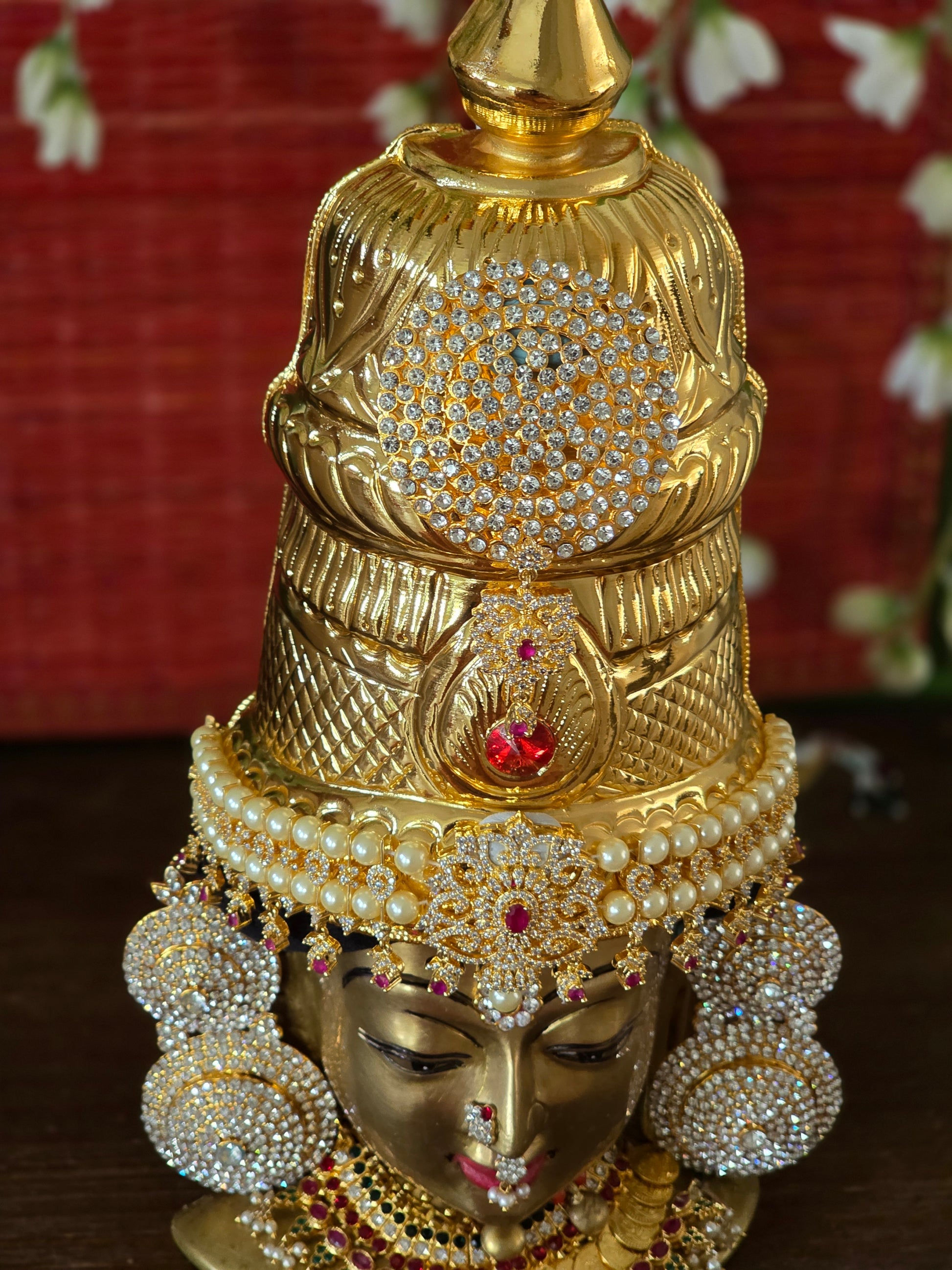 Adorn your deity with ethereal elegance through the Rajnitha Kiritam, a handcrafted crown featuring delicate white and pink stones surrounded by cascades of pearls. Inspired by celestial goddess alankaram, this crown brings softness, grace, and divine charm to your pooja setup. Ideal for Ammavaru, Lakshmi Devi, or any feminine deity, this piece turns every darshan into a radiant moment.