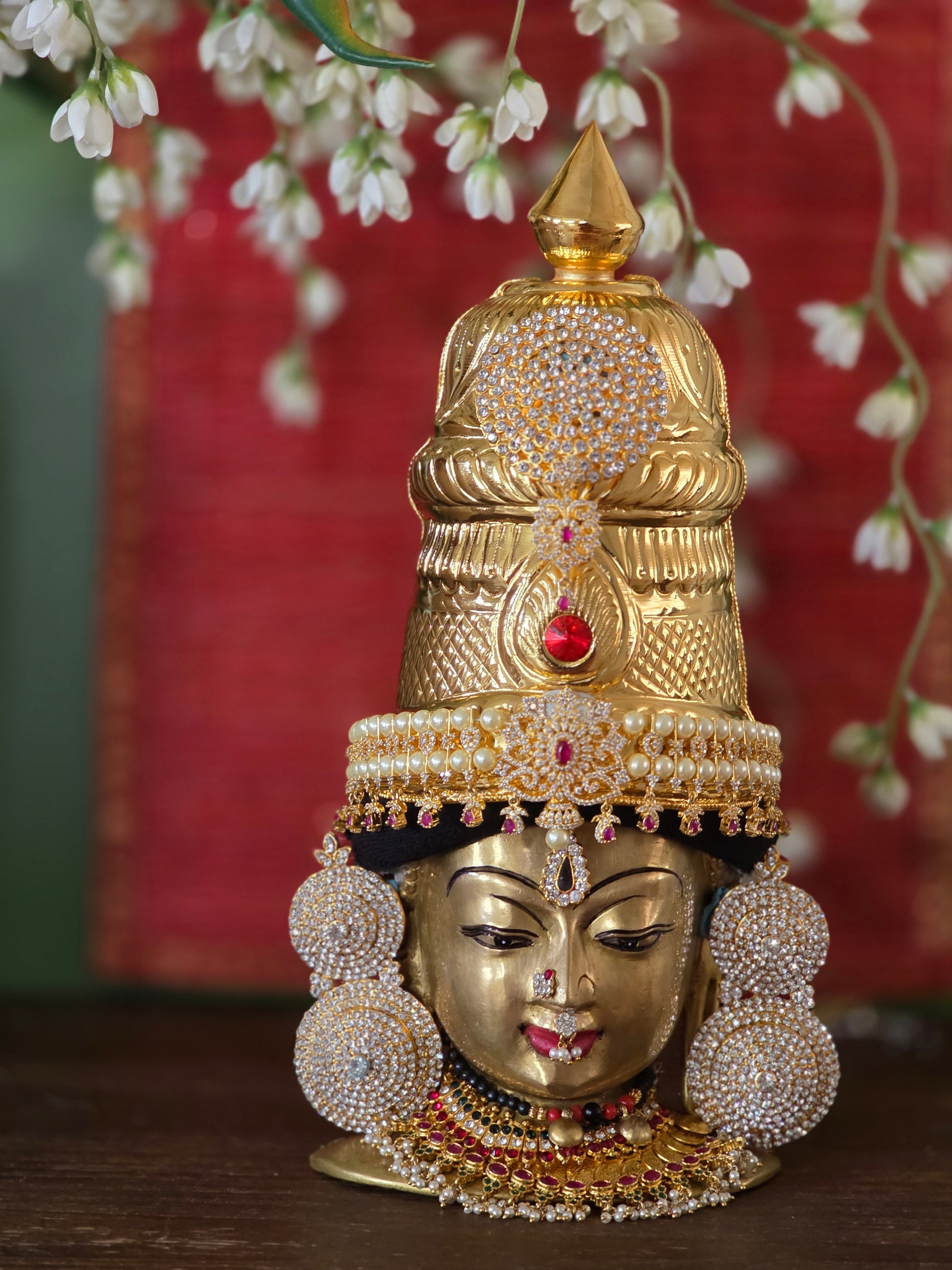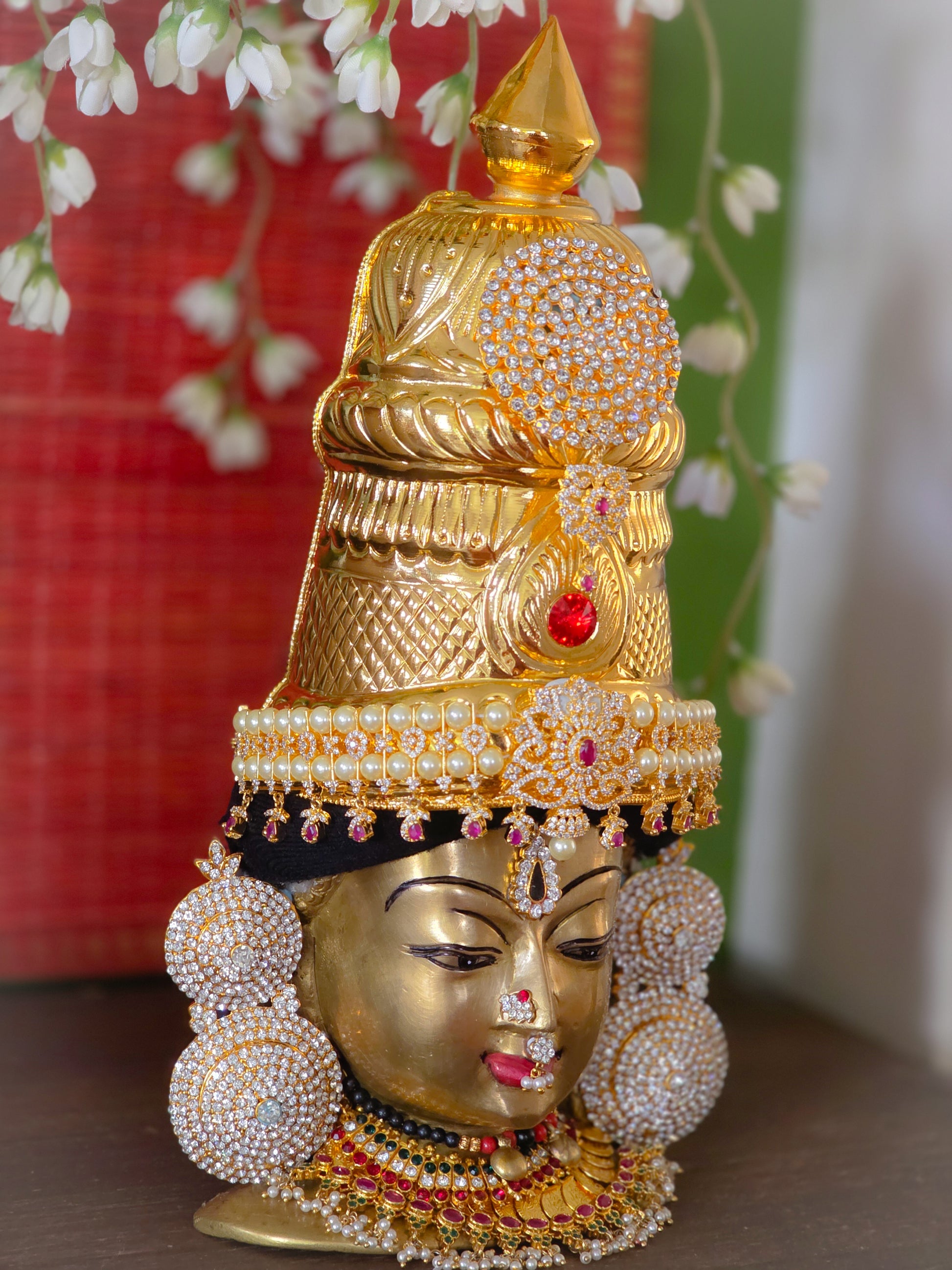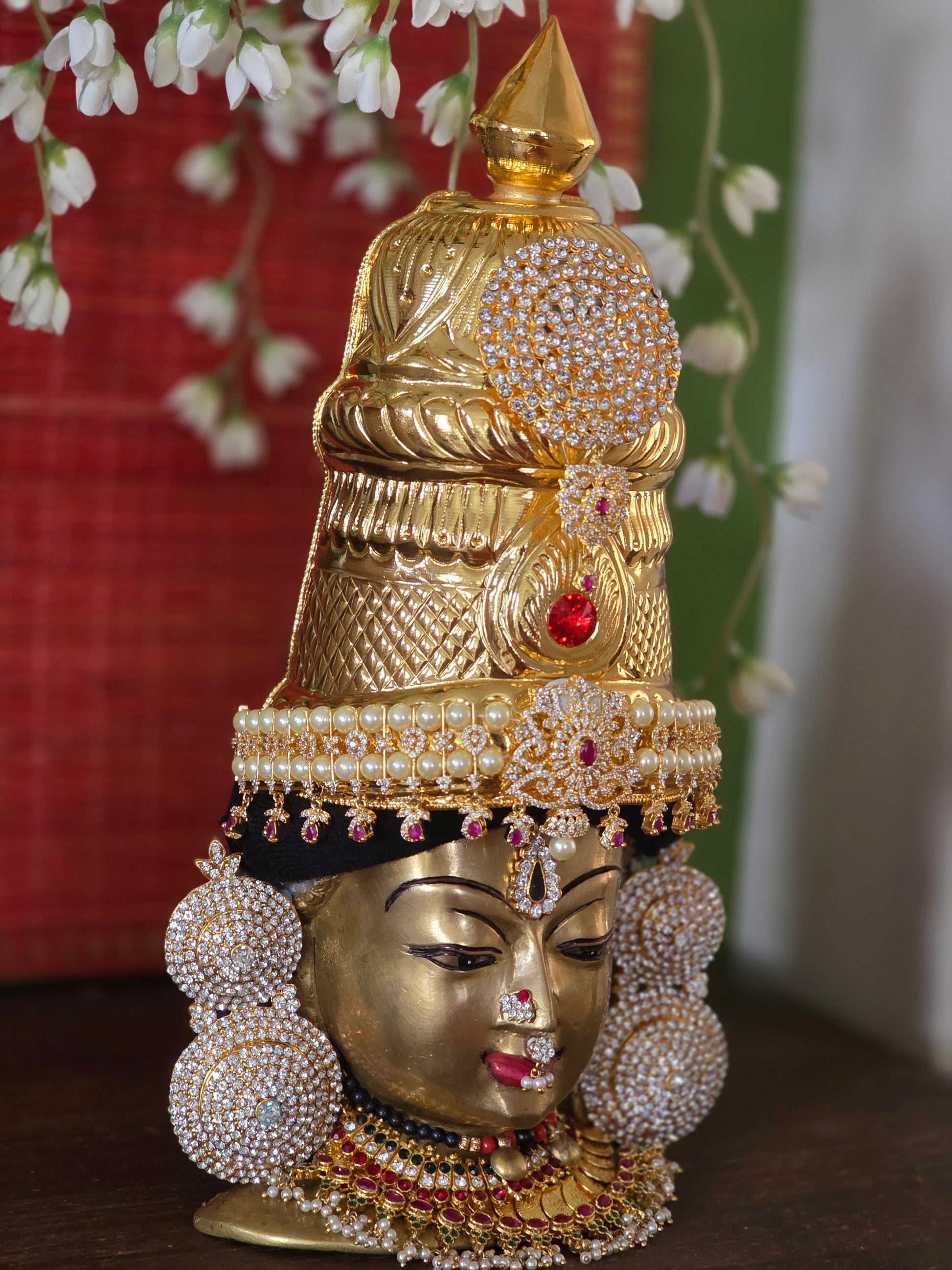 Adorn your deity with ethereal elegance through the Rajnitha Kiritam, a handcrafted crown featuring delicate white and pink stones surrounded by cascades of pearls. Inspired by celestial goddess alankaram, this crown brings softness, grace, and divine charm to your pooja setup. Ideal for Ammavaru, Lakshmi Devi, or any feminine deity, this piece turns every darshan into a radiant moment.