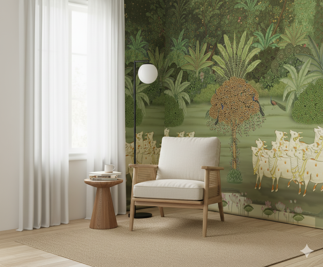 Immerse yourself in the idyllic charm and spiritual resonance of "Yamuna Tat," a captivating wallpaper design inspired by the lush landscapes and sacred lore of Vrindavan. This exquisite creation, reminiscent of traditional Pichwai art, transports you to the serene banks of the revered Yamuna River, where nature flourishes in divine harmony.
