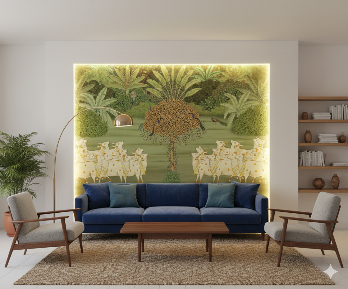 The heart of "Yamuna Tat" lies in its graceful herd of Pichwai-style cows, adorned with traditional garlands and decorative elements. These revered animals, depicted with gentle eyes and serene expressions, are synonymous with Vrindavan and the pastoral life of Lord Krishna. Their presence infuses the scene with a sense of peace, abundance, and devotion.